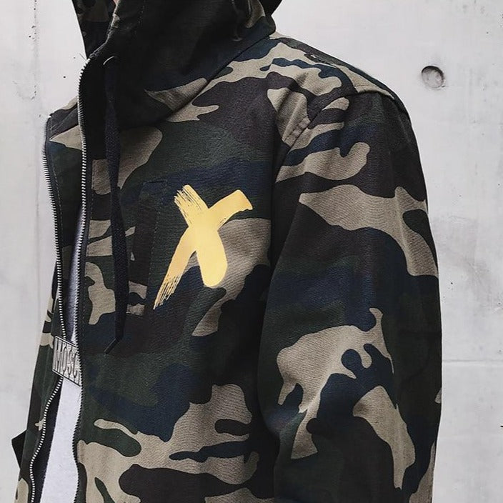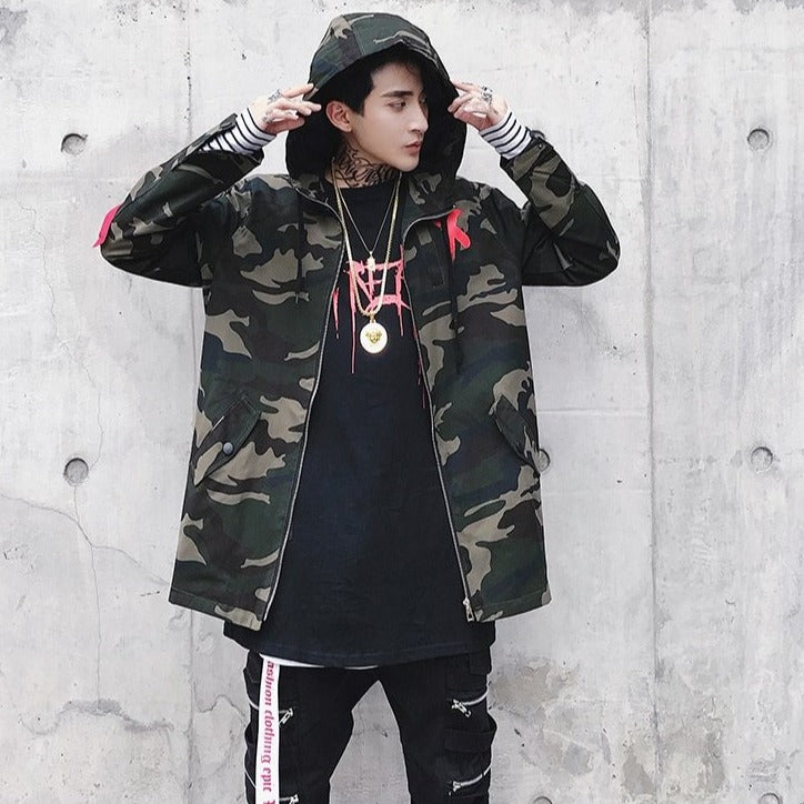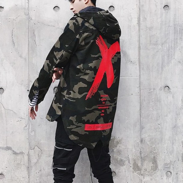 I giovani coreani devono fare il servizio militare. La moda ha trasformato il motivo mimetico per creare un bel cappotto streetwear. Questo cappotto coreano ha una grande X sul retro. È un cappotto con cappuccio di tendenza tra i giovani.