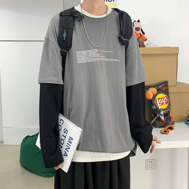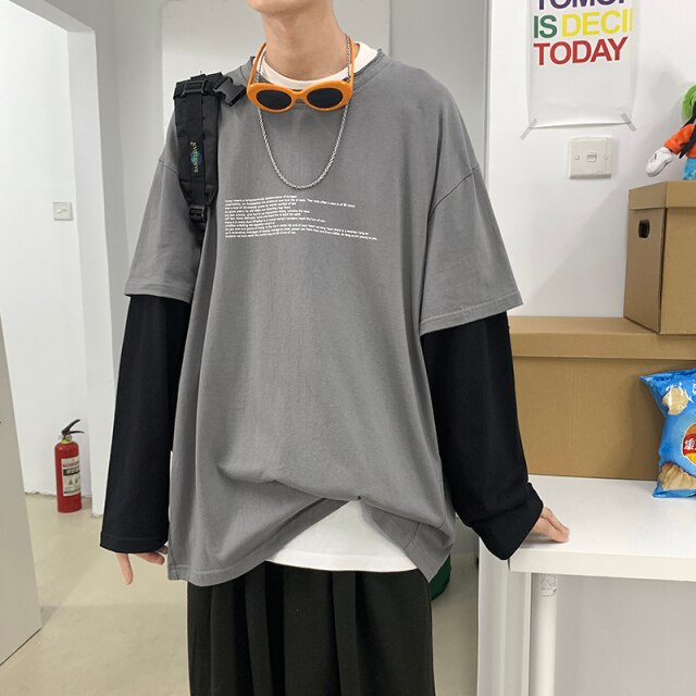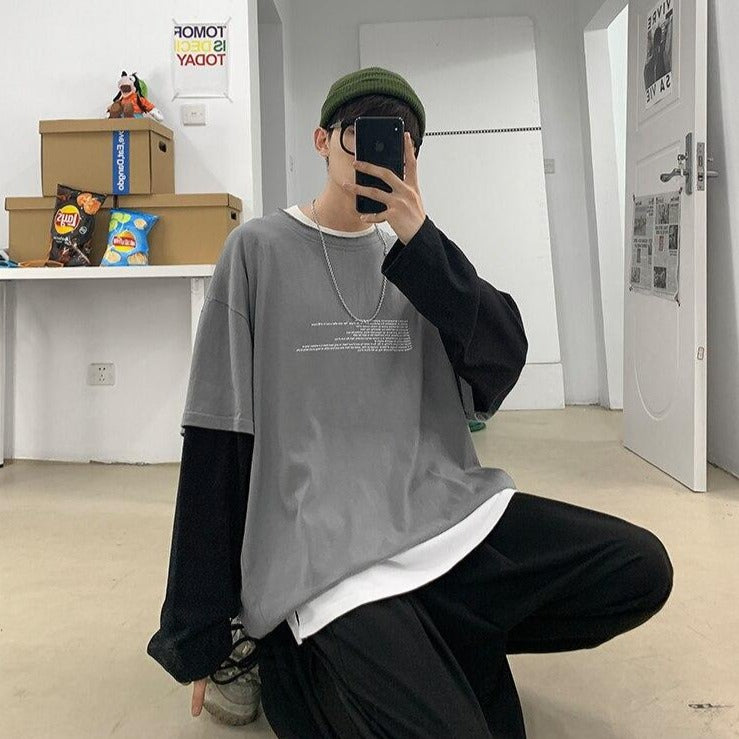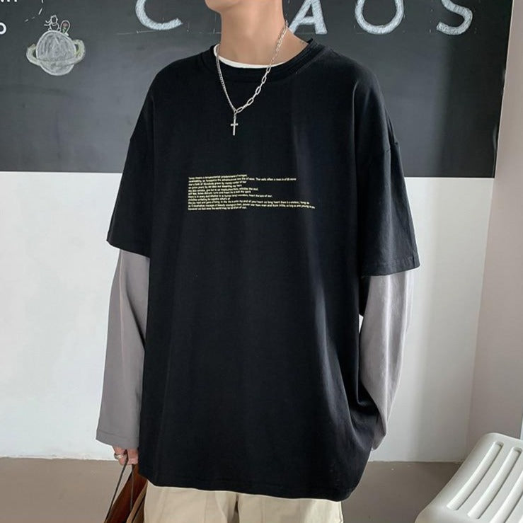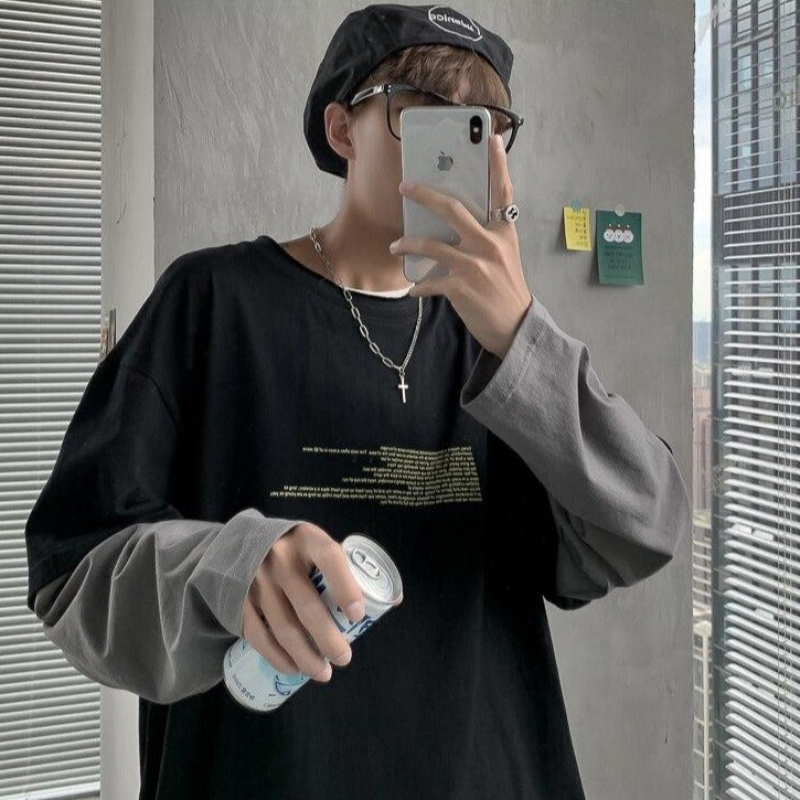 Questa T-shirt a maniche lunghe ha due parti distinte. È un capo simpatico che può essere indossato sia in estate che in inverno. È molto piacevole e presenta un'intrigante stampa testuale. È una T-shirt di tendenza nelle strade di Seoul perché è vintage.