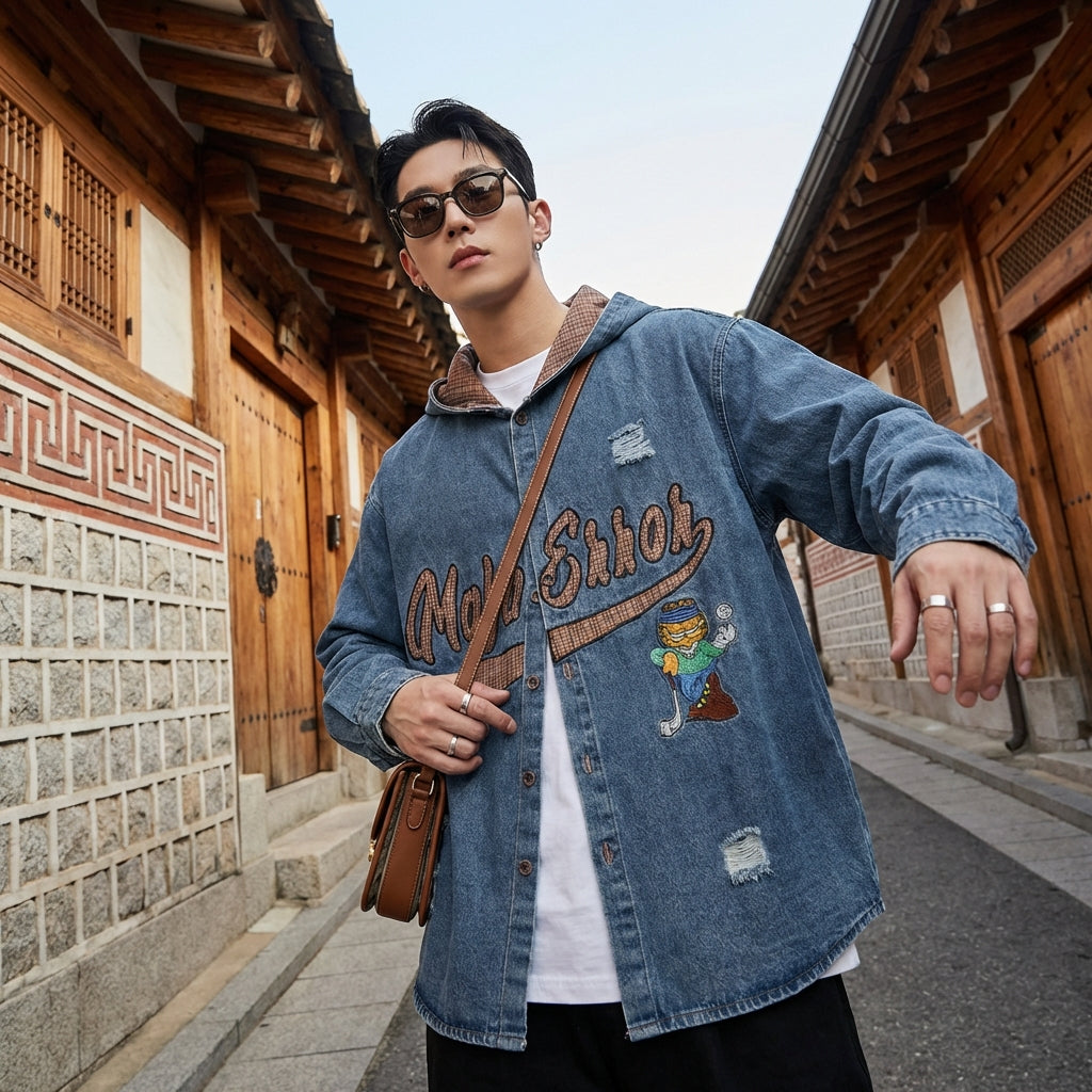 Chemise à capuche denim brodée unisexe - Koreanxwear