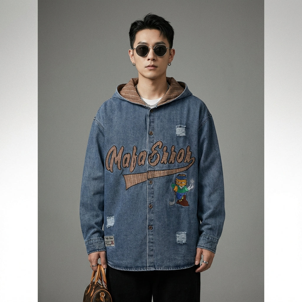 Adotta un look casual e di tendenza con la nostra camicia con cappuccio in denim, impreziosita da lettere ricamate. Il suo taglio ampio e lo stile retrò slavato la rendono un must-have per un'allure urbana ed elegante. Perfetta per lei e per lui! ✨