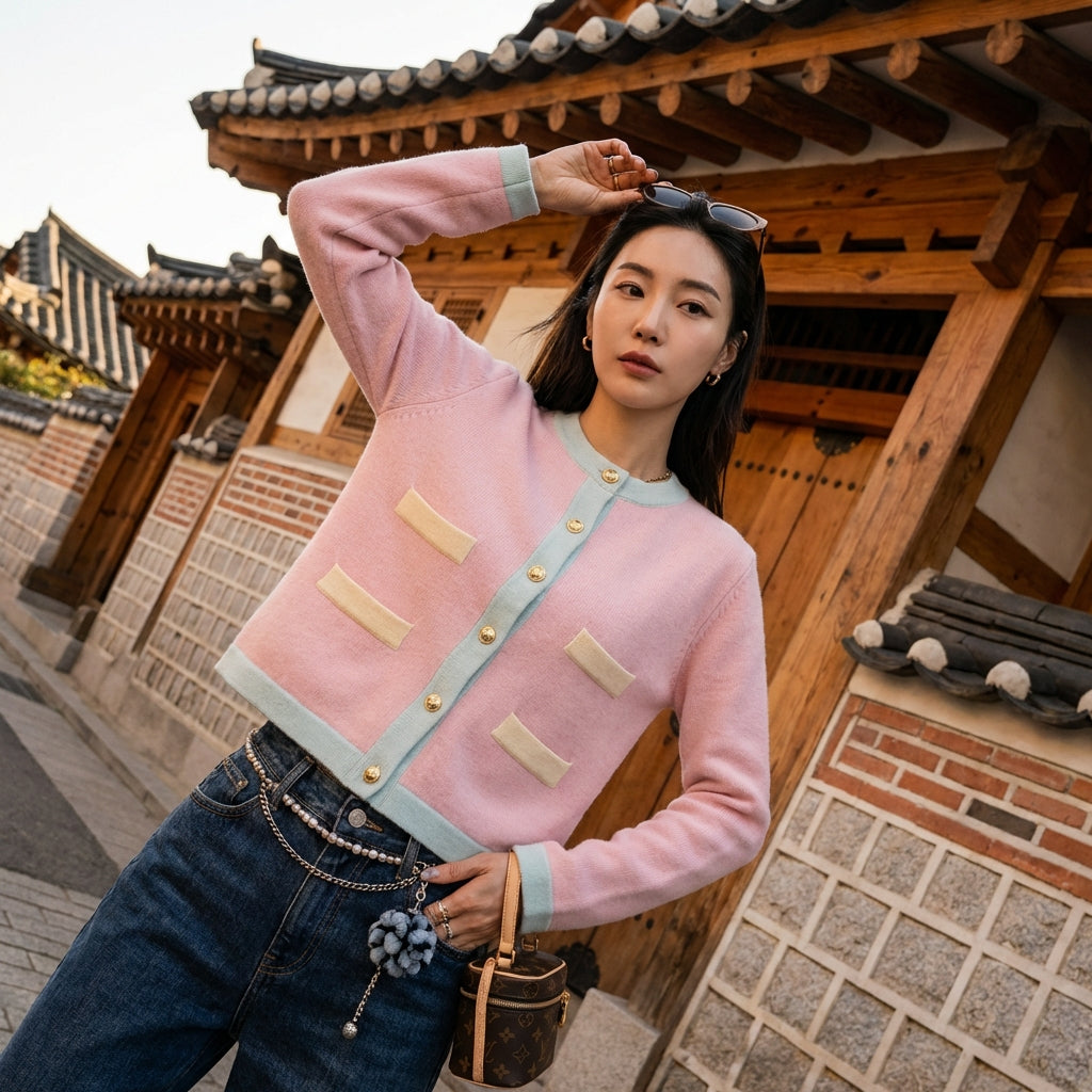 Questo cardigan in lana rosa è il capo ideale per completare il tuo guardaroba con un tocco di colore e raffinatezza, rimanendo sempre all'avanguardia della moda coreana.