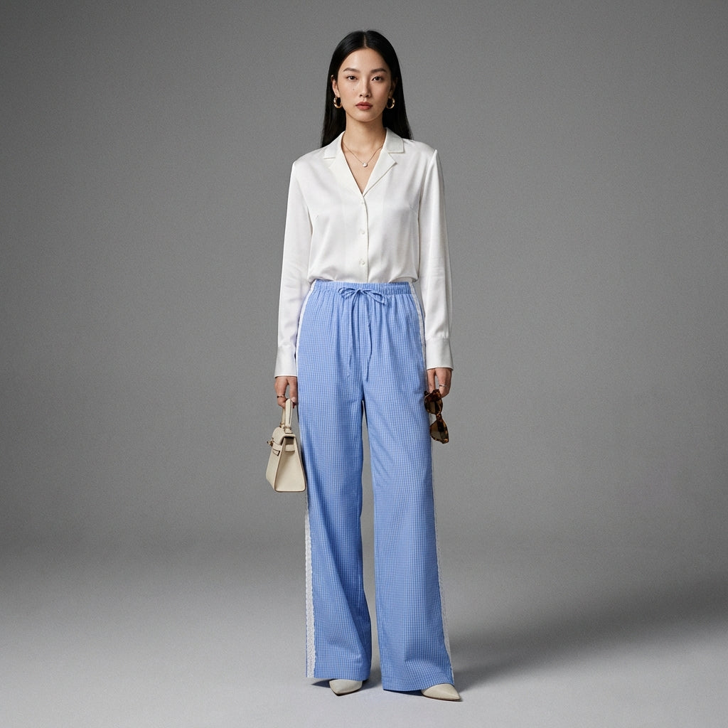Adotta un look casual e chic con i nostri pantaloni larghi a vita elasticizzata, impreziositi da delicate applicazioni in pizzo blu. Progettati per il comfort e lo stile, ti accompagneranno perfettamente nella vita di tutti i giorni! 💙