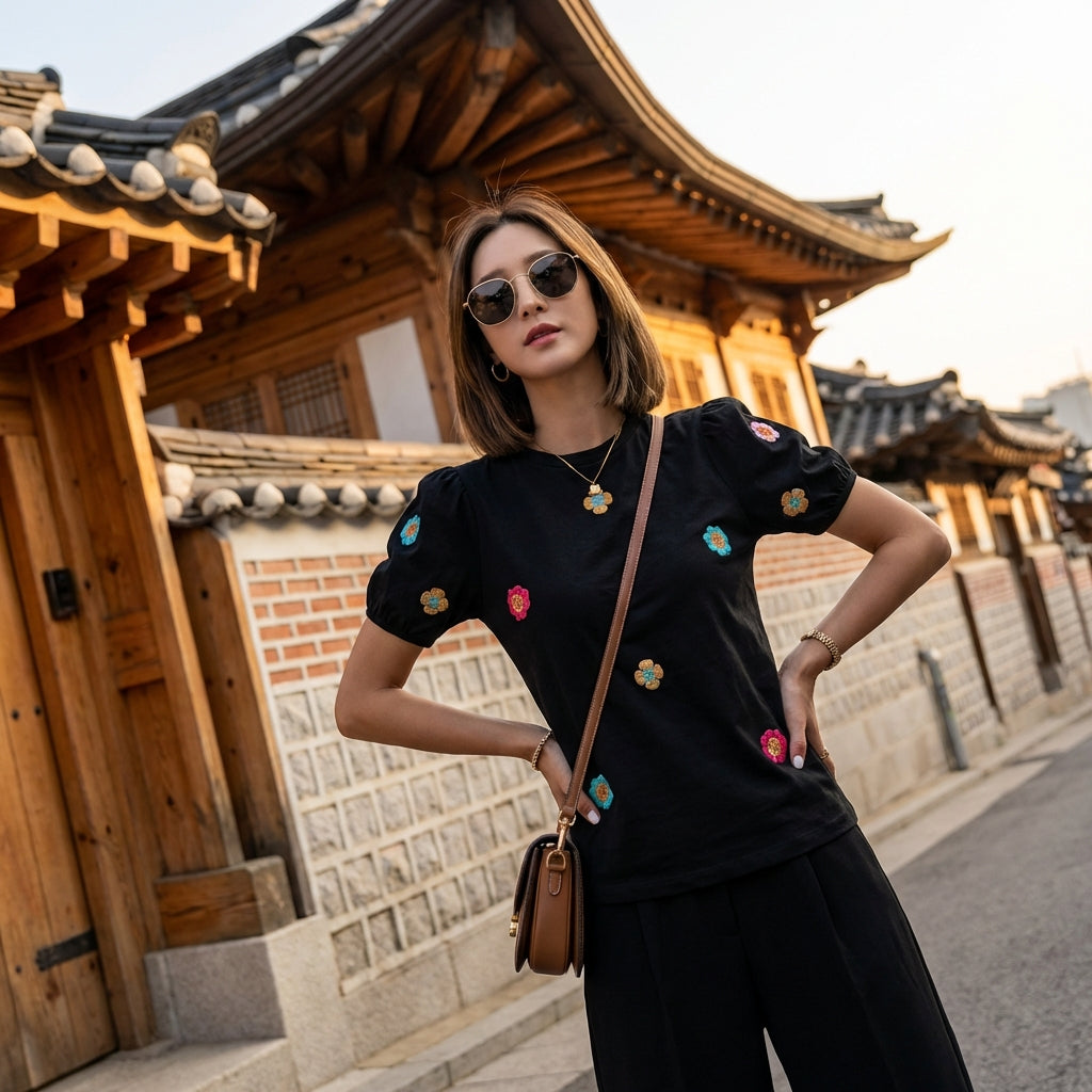 Questa T-shirt ricamata è un'aggiunta essenziale al tuo guardaroba estivo, unendo stile, comfort e un tocco di raffinatezza coreana.
