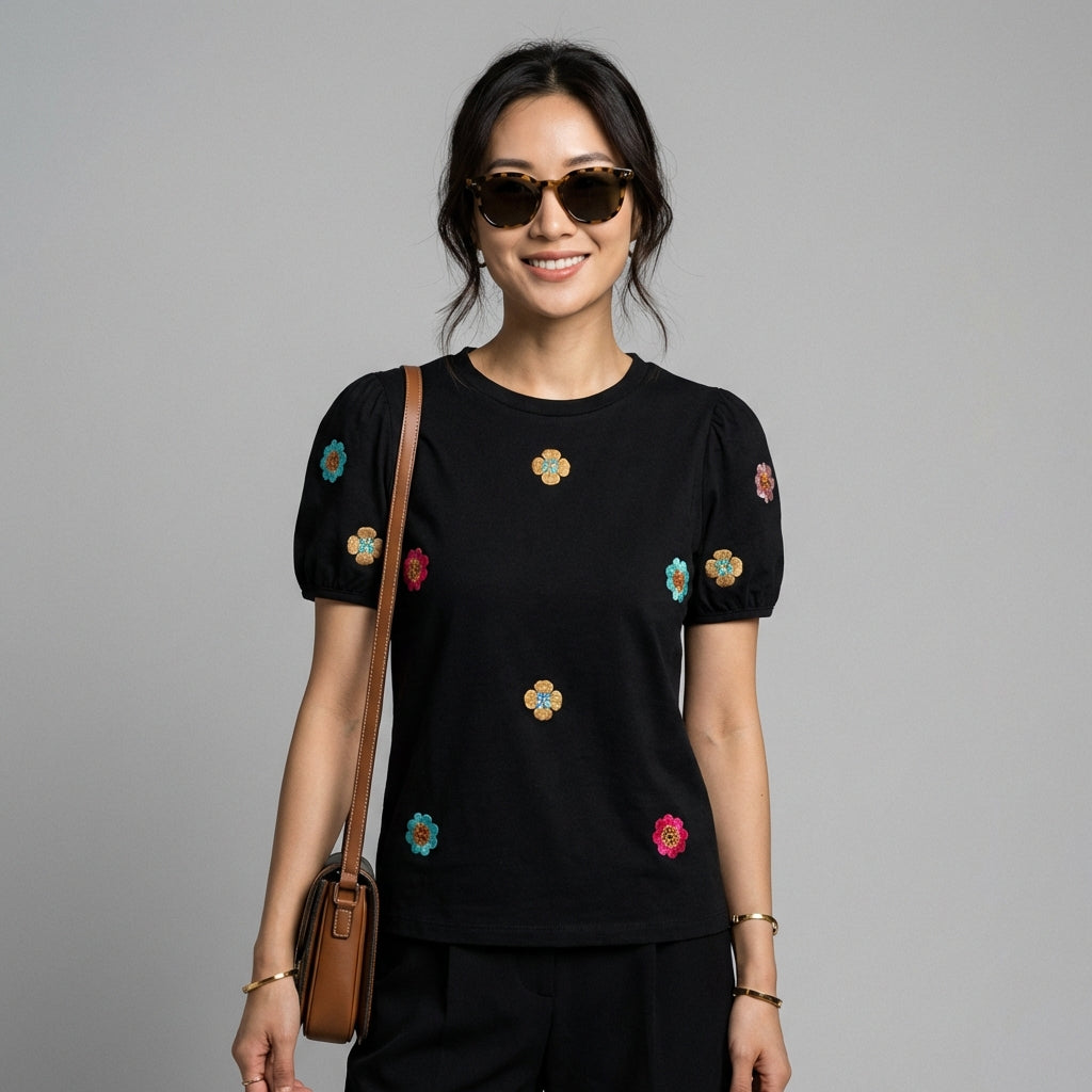 Adotta un look fresco e alla moda con la nostra T-shirt a maniche a sbuffo, impreziosita da un delicato ricamo floreale. Perfetta per aggiungere un tocco di femminilità e dolcezza ai tuoi outfit estivi! 🌸
