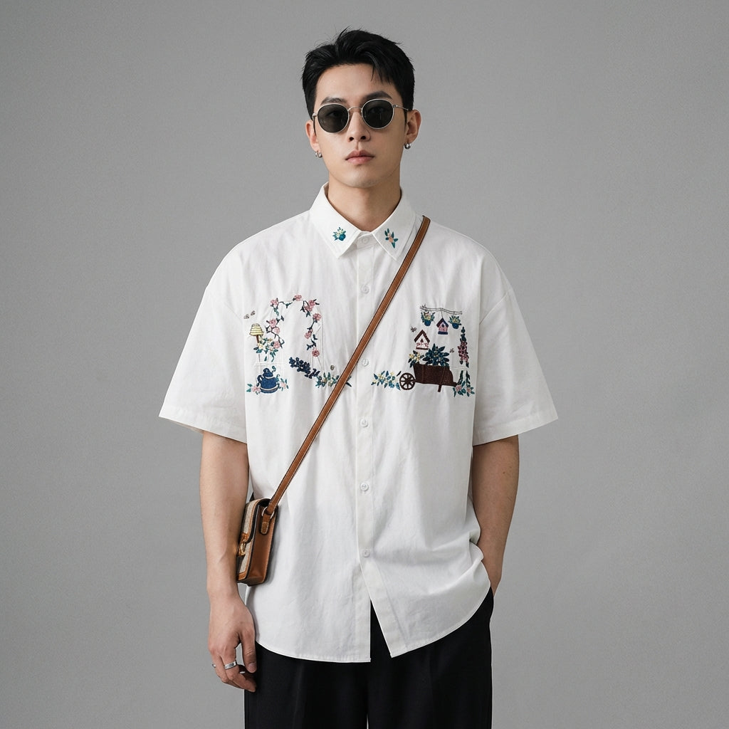 Adotta un look casual e alla moda con la nostra camicia ampia a maniche corte, impreziosita da delicati ricami floreali. Il suo colletto a revers e il taglio rilassato la rendono una scelta ideale per uno stile moderno e confortevole! 🌸