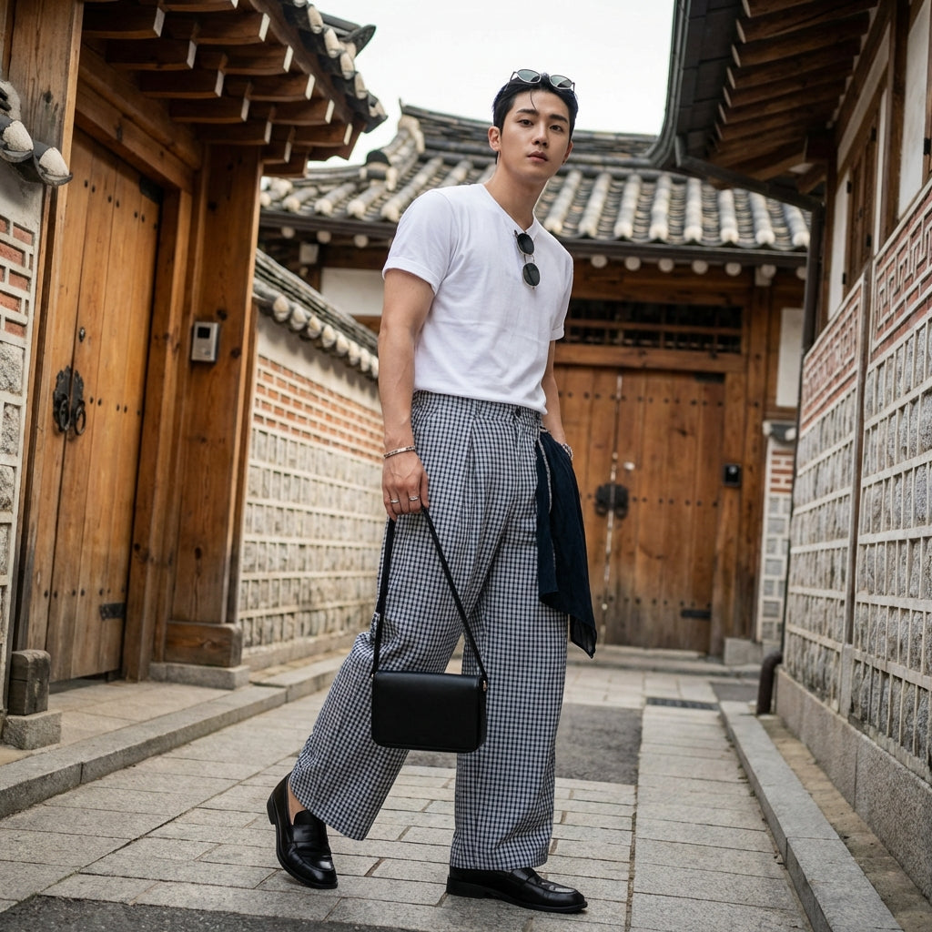 Pantalon streetwear à carreaux plissé blanc et bleu pour homme - Koreanxwear - Taille S