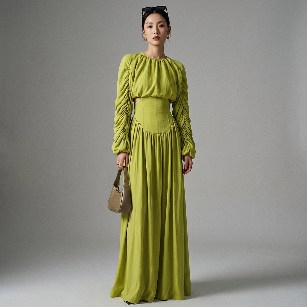 Scopri il nostro elegante completo, composto da un top corto arricciato e una gonna lunga drappeggiata a vita alta. Perfetto per un look sofisticato e moderno in ogni occasione! 💚