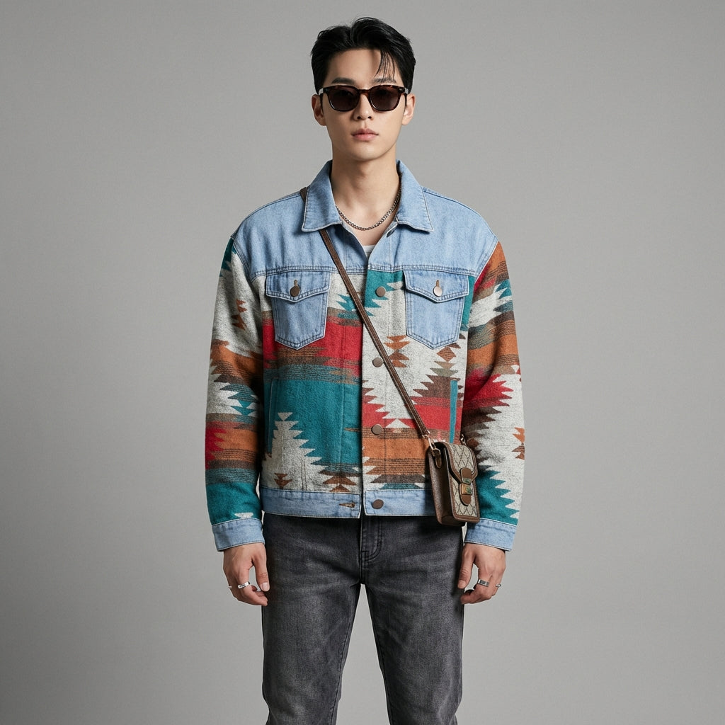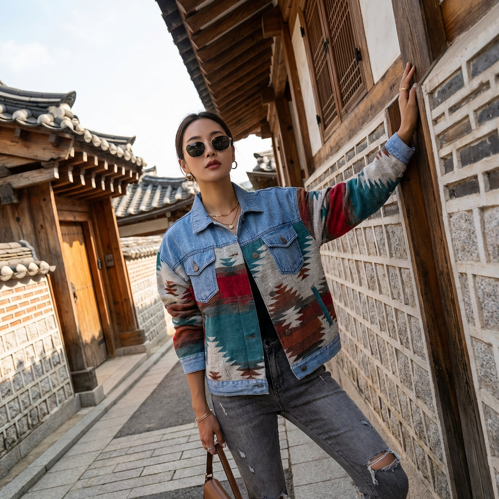 Adotta un look moderno e casual con la nostra giacca camicia a motivi geometrici. Ideale per la stratificazione, aggiunge un tocco di originalità al tuo outfit. Perfetta per uno stile K-fashion deciso! 💙