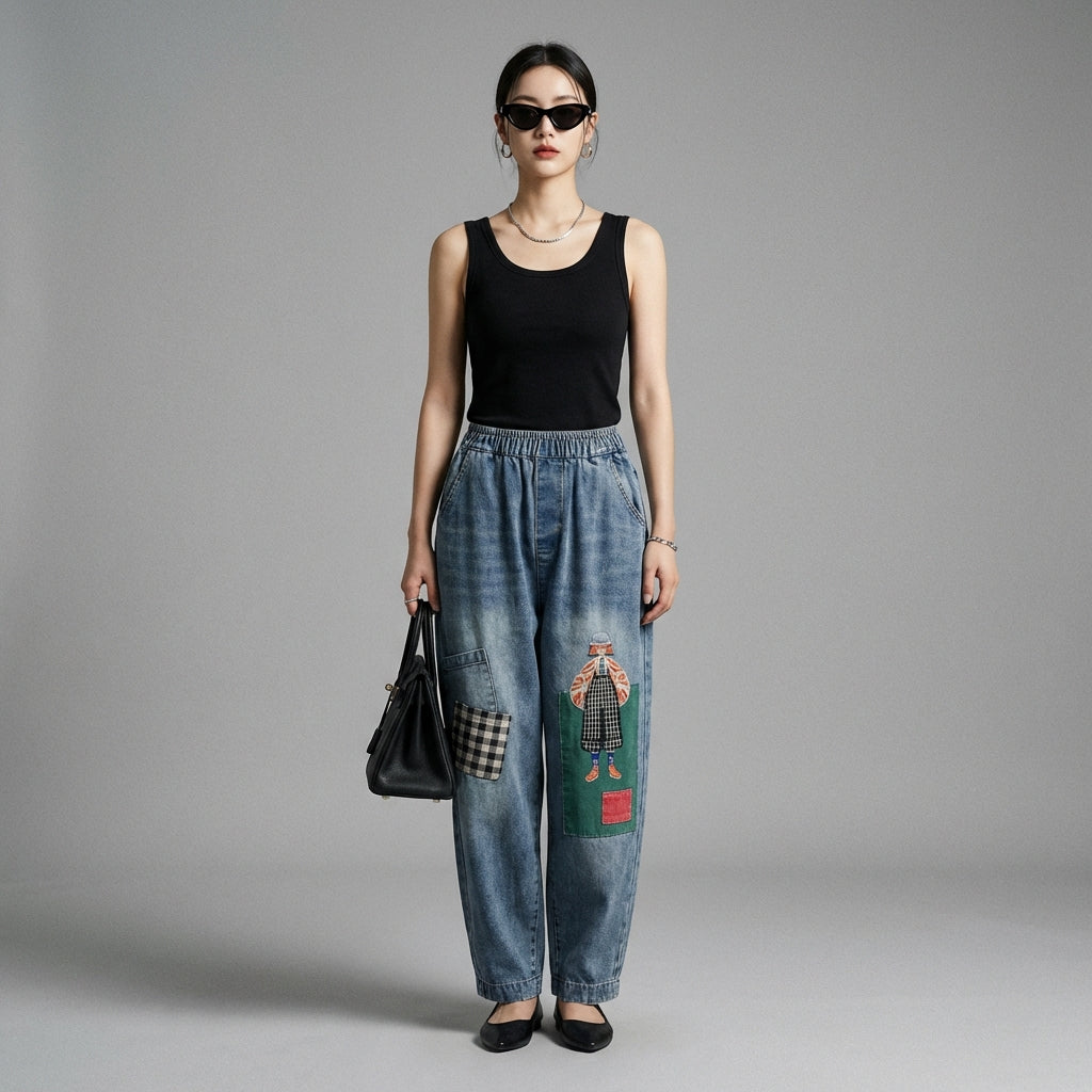 Pantalon harem denim brodé femme - K-fashion décontractée