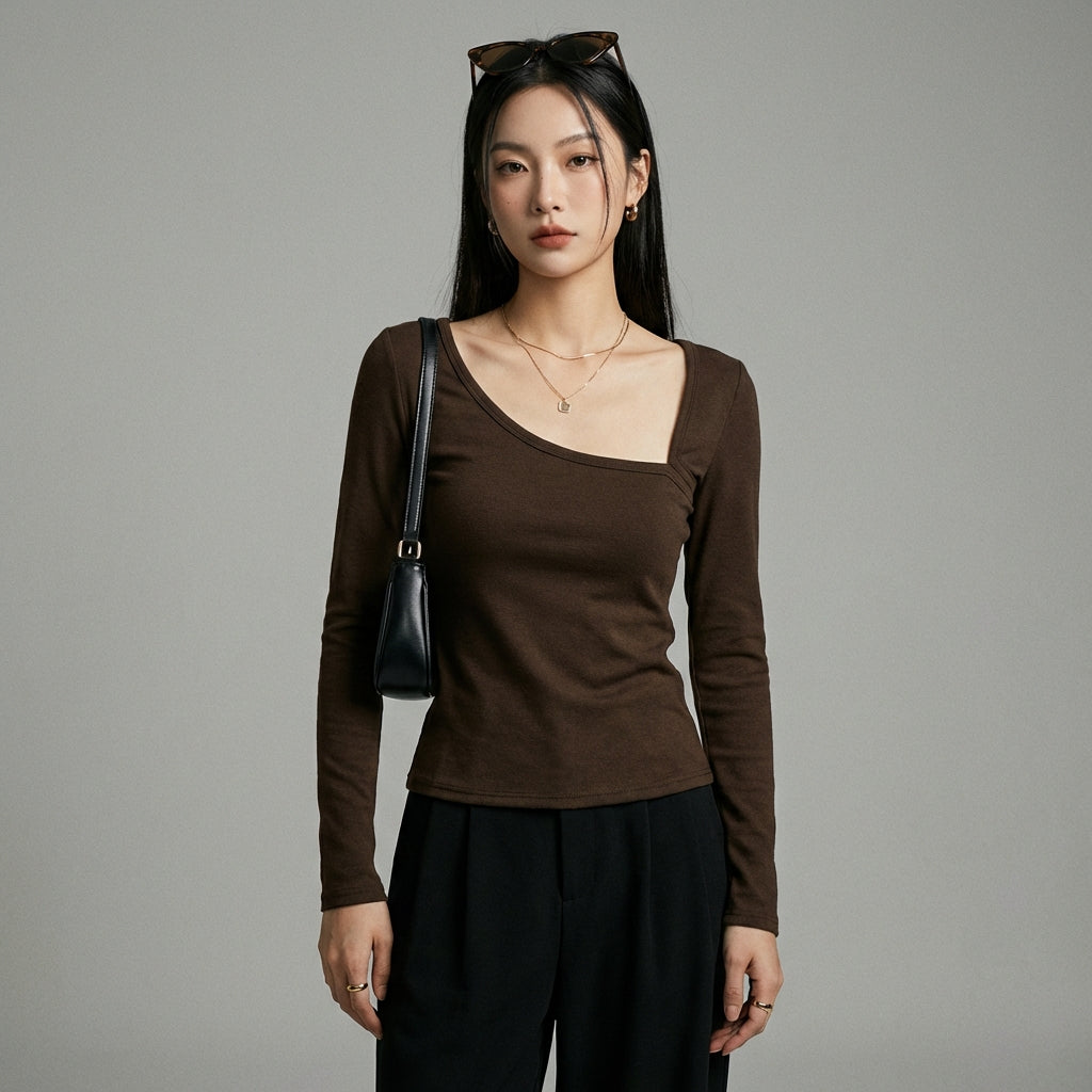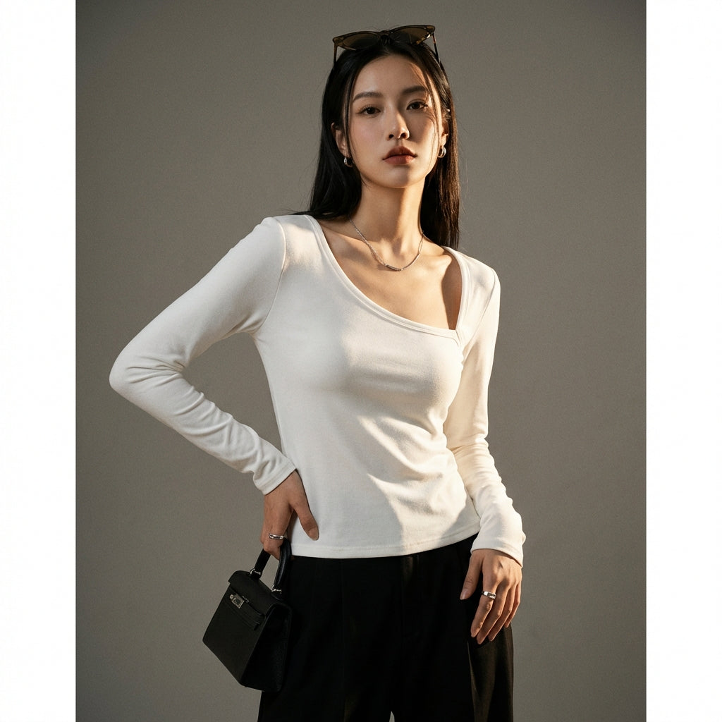 Afferma il tuo stile con questa t-shirt unica, caratterizzata da un audace taglio asimmetrico sulla spalla e maniche lunghe per un look moderno e sofisticato. Perfetta per un tocco di originalità nella vita di tutti i giorni! ✨