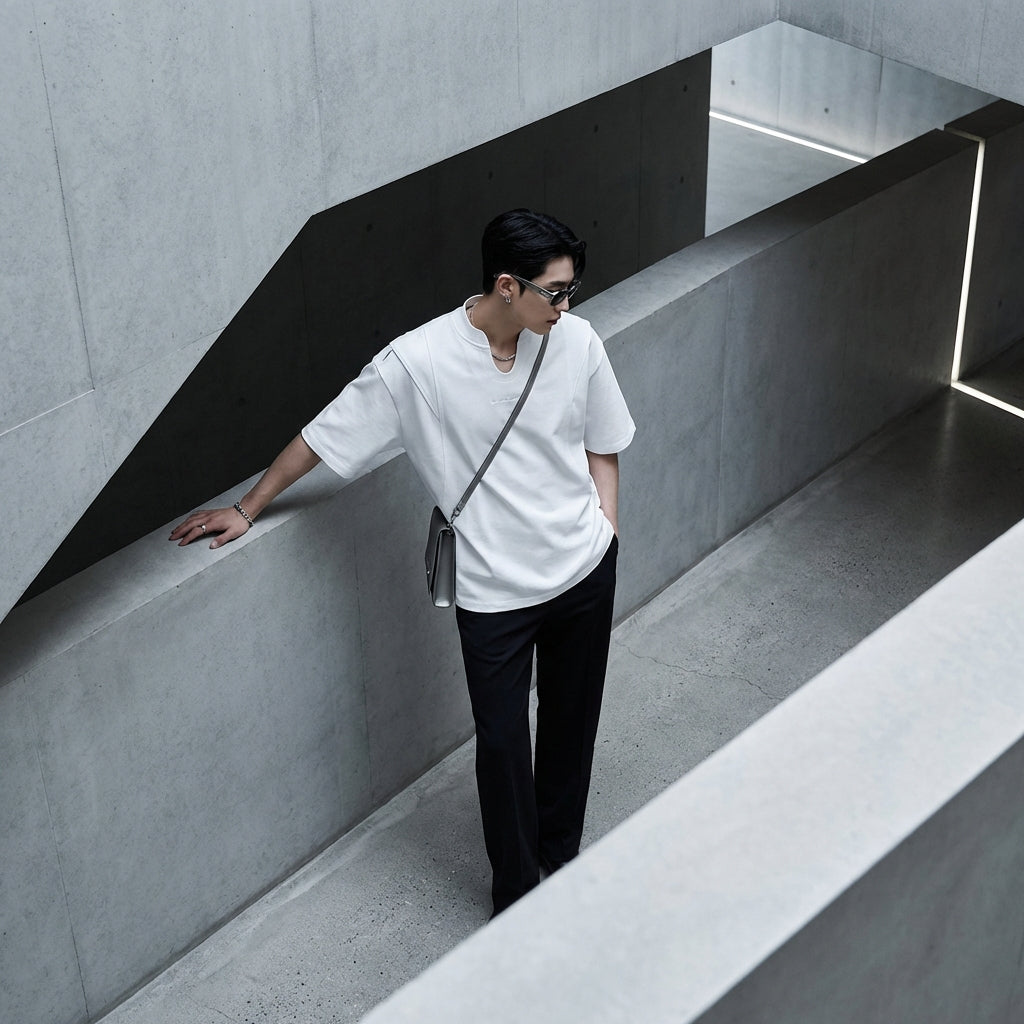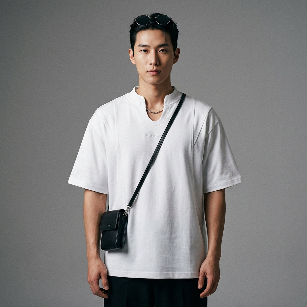 - Stile: Streetwear, Minimalista, K-fashion. Questa t-shirt incarna la semplice eleganza dello streetwear coreano, perfetta per un look urbano e moderno.