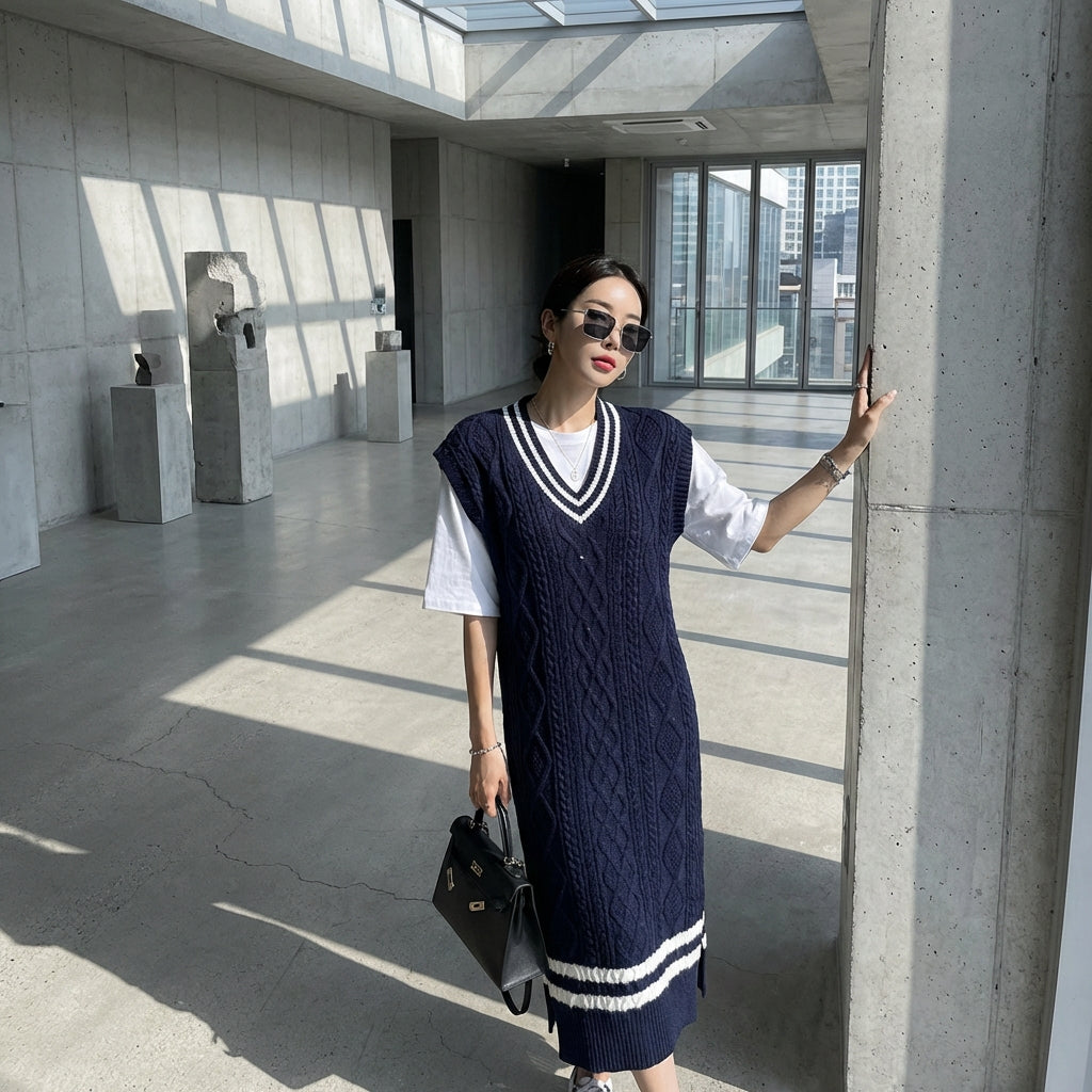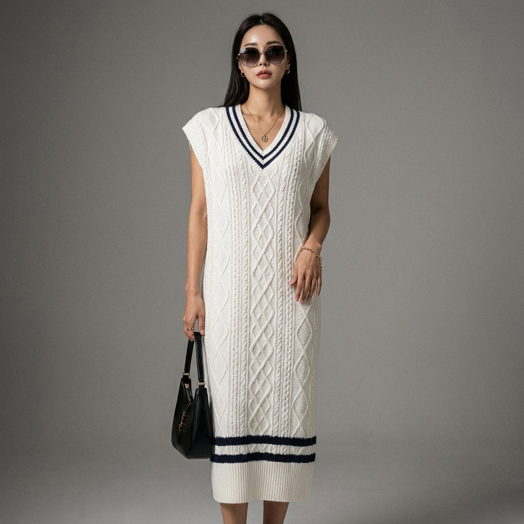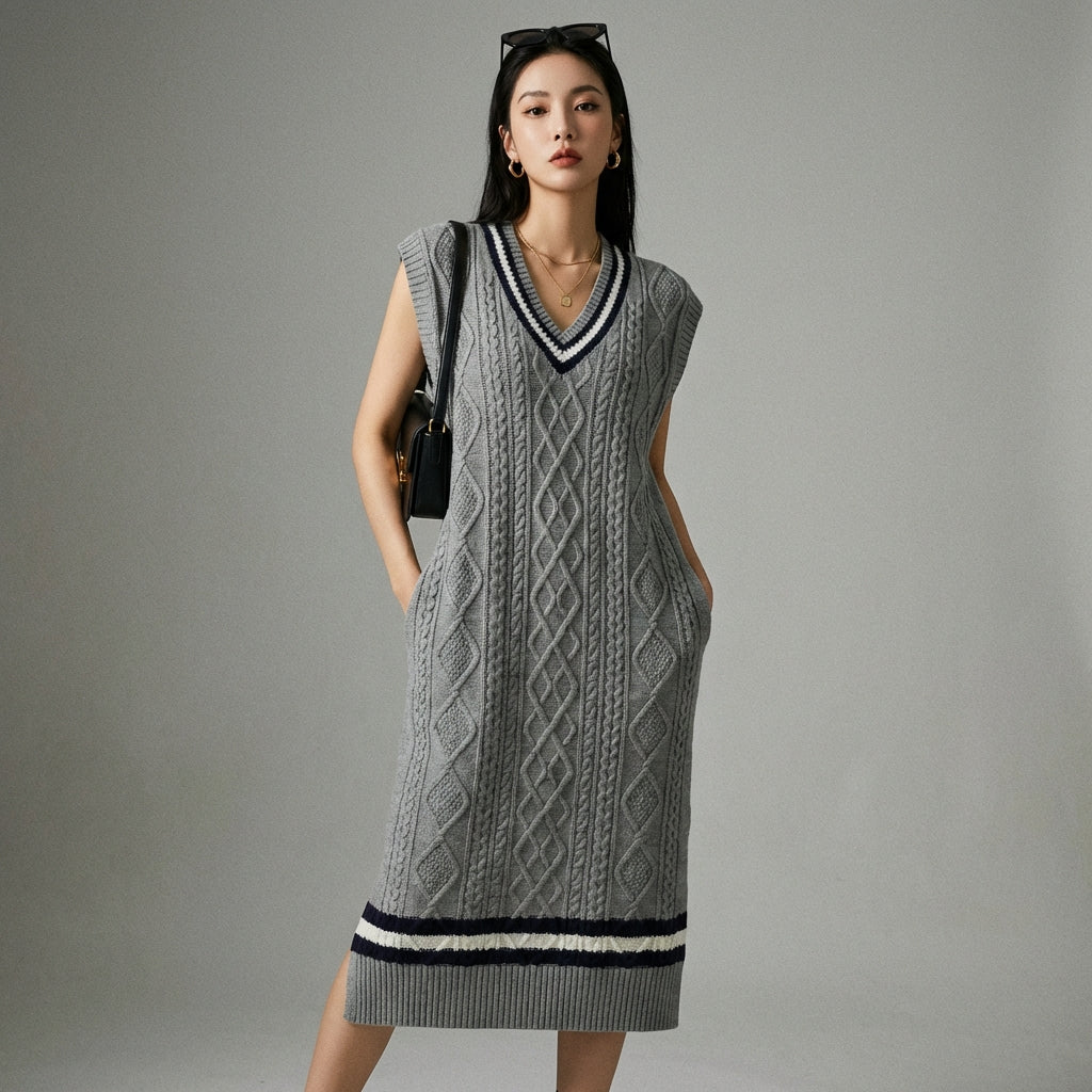 Scopri il nostro vestito canotta in maglia, un capo irrinunciabile con un elegante scollo a V e dettagli a treccia. La sua vestibilità a trapezio e il suo stile preppy lo rendono una scelta perfetta per un look casual chic o streetwear. Adotta l'eleganza senza sforzo! ✨