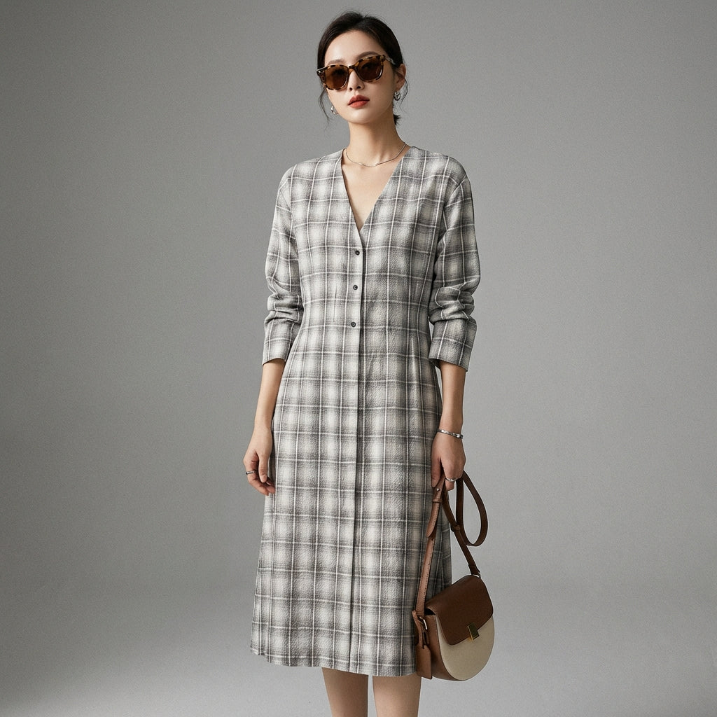 Adotta un look chic e intramontabile con il nostro abito lungo a quadri, caratterizzato da un elegante scollo a V e maniche lunghe. Il suo taglio fluido e il motivo classico lo rendono un capo essenziale per ogni occasione, unendo comfort e raffinatezza! 👗