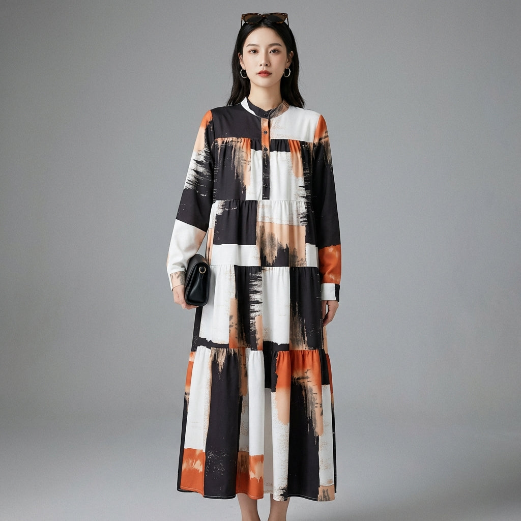- Tipo: Abito lungo, Taglio ampio. Una silhouette rilassata ed elegante, che offre grande libertà di movimento.