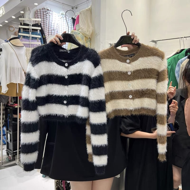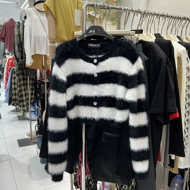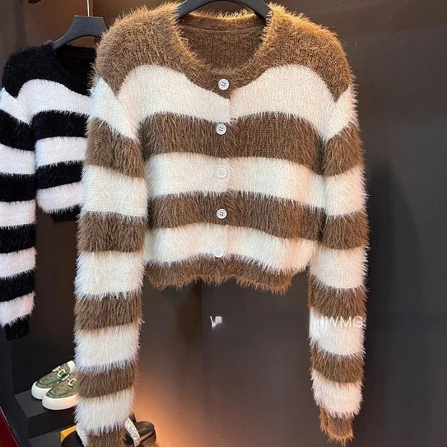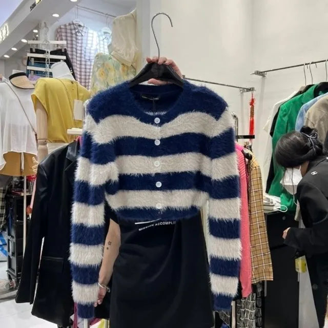 Aggiungi un tocco di stile coreano al tuo guardaroba con il nostro cardigan a righe da donna. Questo modello corto e morbido, con il suo scollo rotondo, è perfetto per un look casual e vintage. 🌟