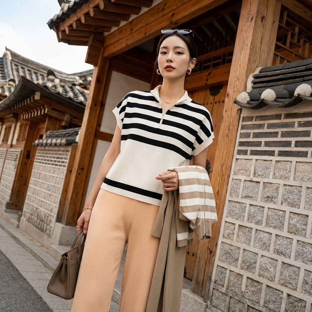 - Stile: Minimalista, Elegante, K-fashion. Questo completo incarna la semplicità raffinata e le linee pulite della moda coreana contemporanea.
