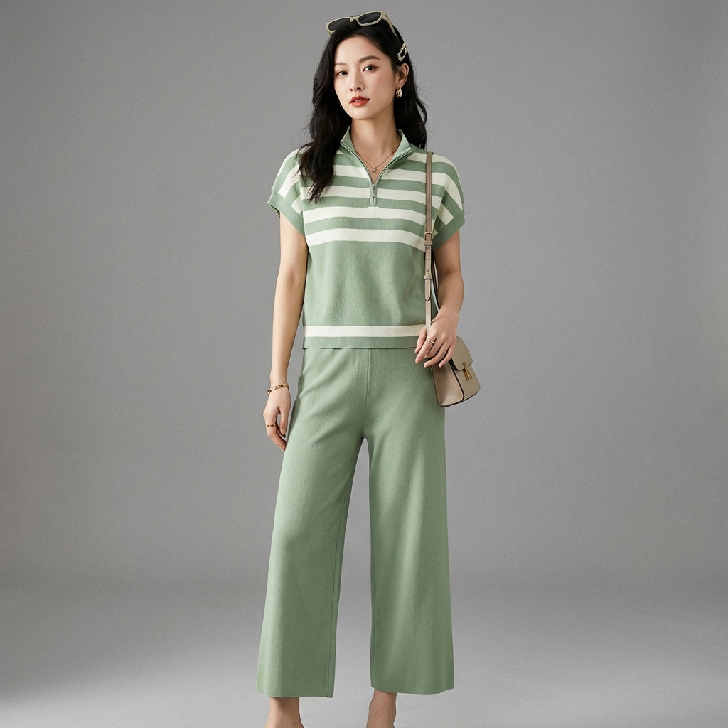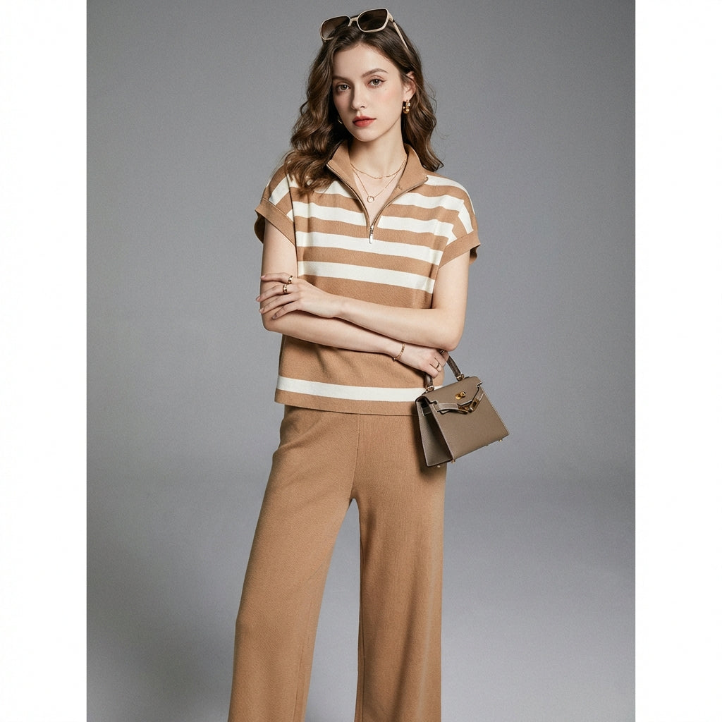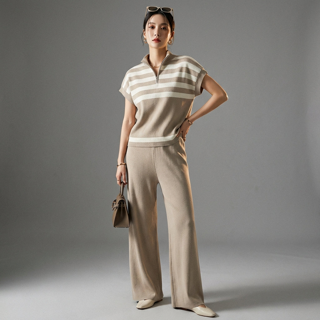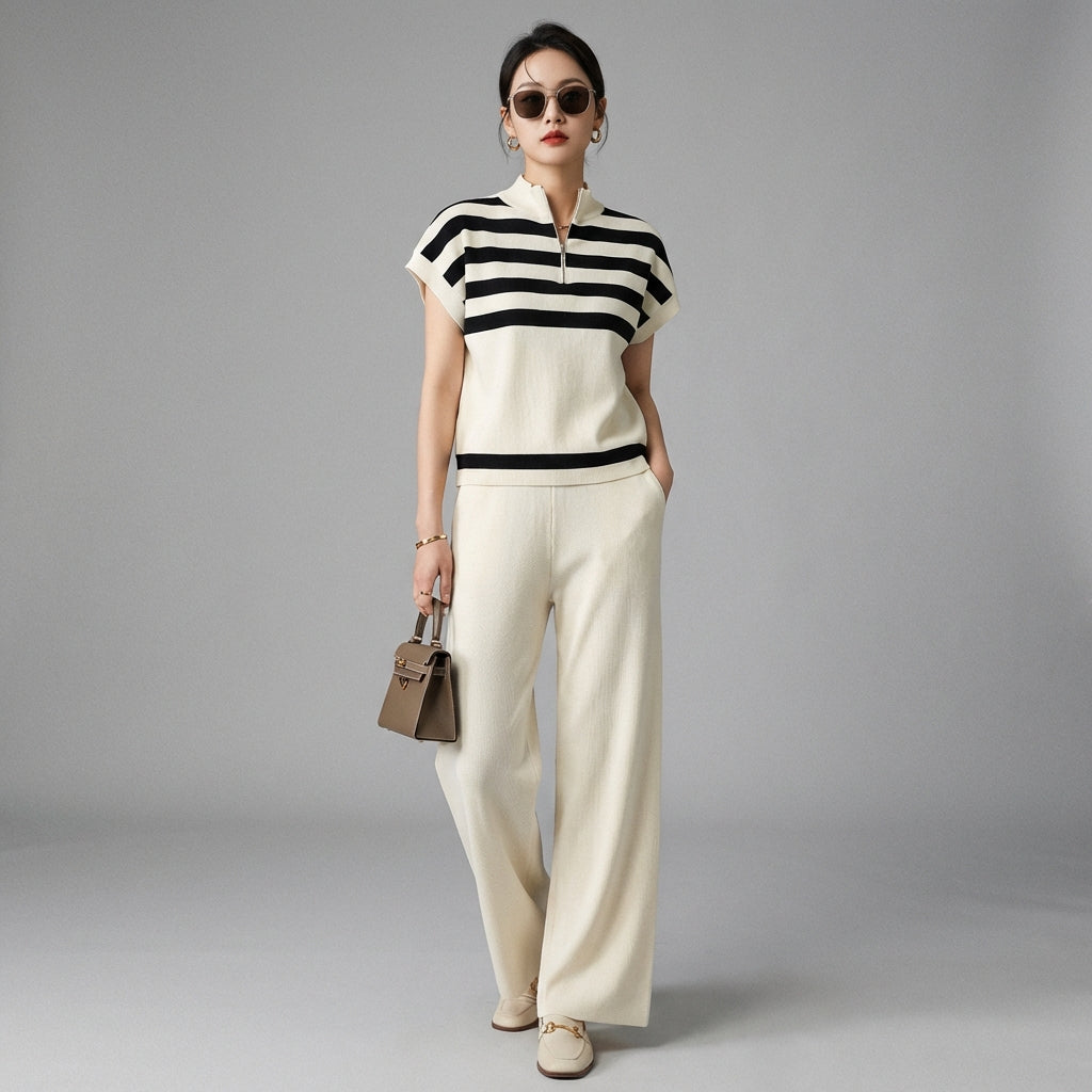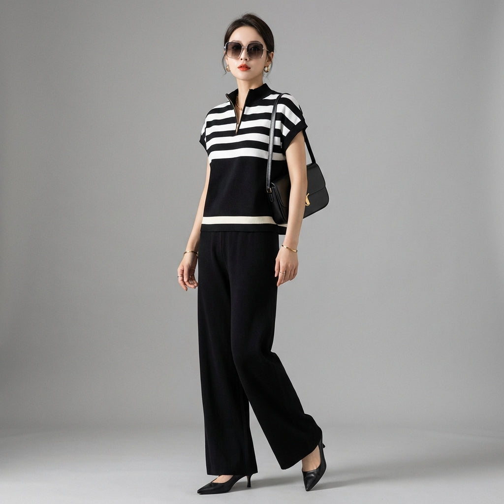 Scoprite l'eleganza moderna con questo completo due pezzi, composto da un top a righe con zip e pantaloni larghi a vita alta. Perfetto per una silhouette chic e casual, questo completo aggiunge un tocco di raffinatezza al vostro guardaroba quotidiano! ✨