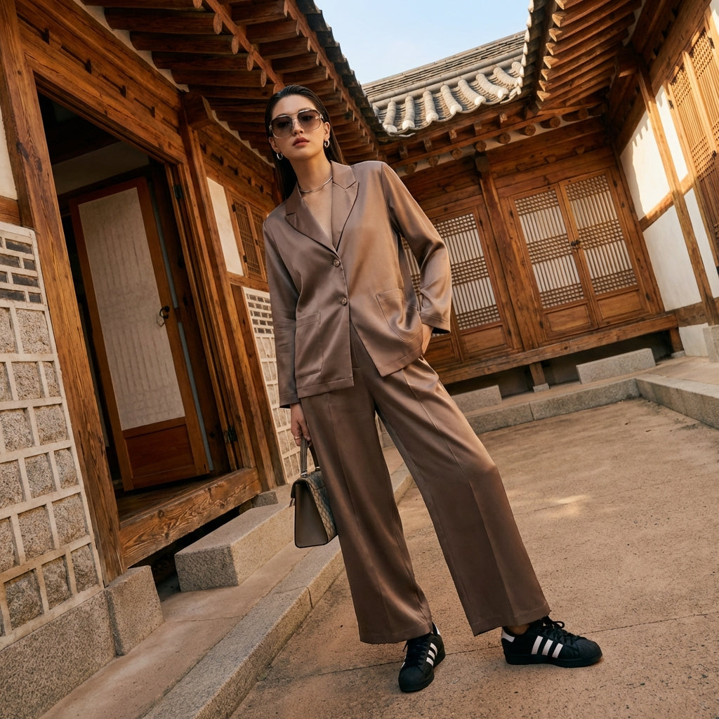 - Stile: K-fashion, Elegante, Casual, British. Questo completo incarna la fusione perfetta tra l'eleganza classica britannica e le tendenze casual della moda coreana, per uno stile versatile e chic.