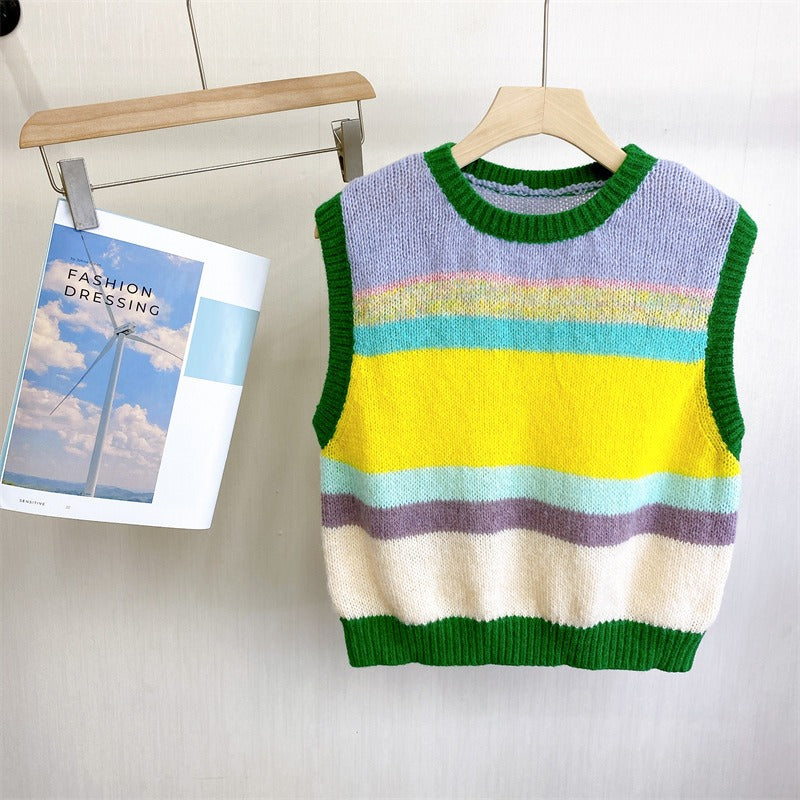 Adotta un look casual ed elegante con il nostro gilet in maglia senza maniche, perfetto per una stratificazione raffinata. Il suo design a blocchi di colore e le sue righe aggiungono un tocco unico al tuo outfit. 🌟