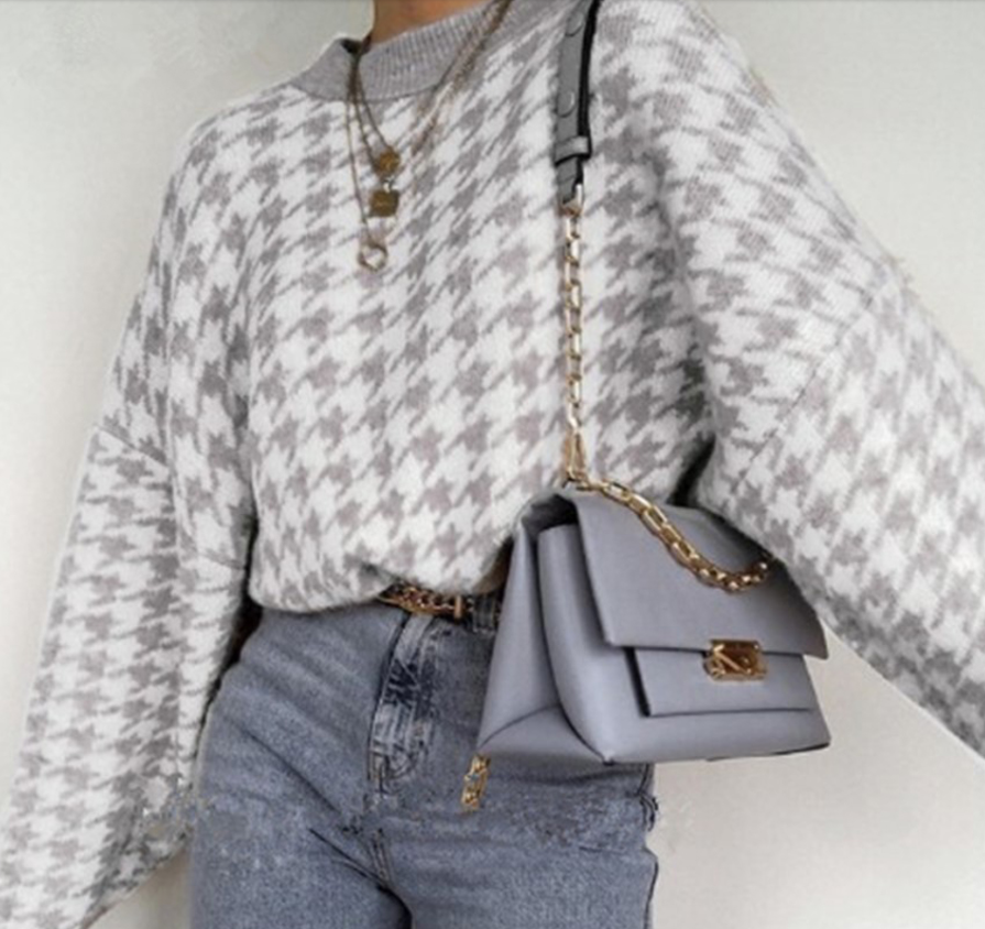 Scopri il nostro maglione geometrico color kaki, perfetto per un look casual e alla moda. Questo maglione retrò con motivo pied-de-poule è ideale per l'autunno e l'inverno, offrendo comfort e stile. 🍂