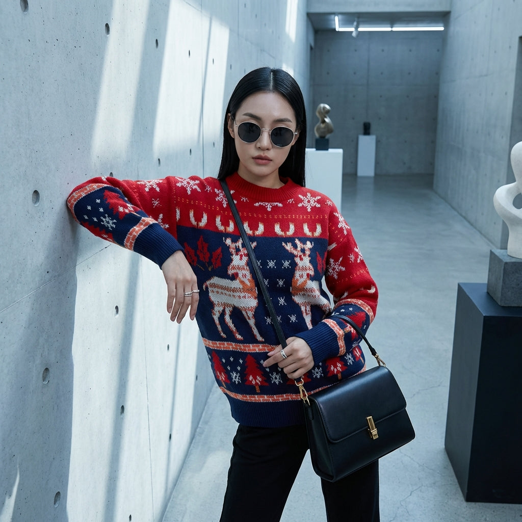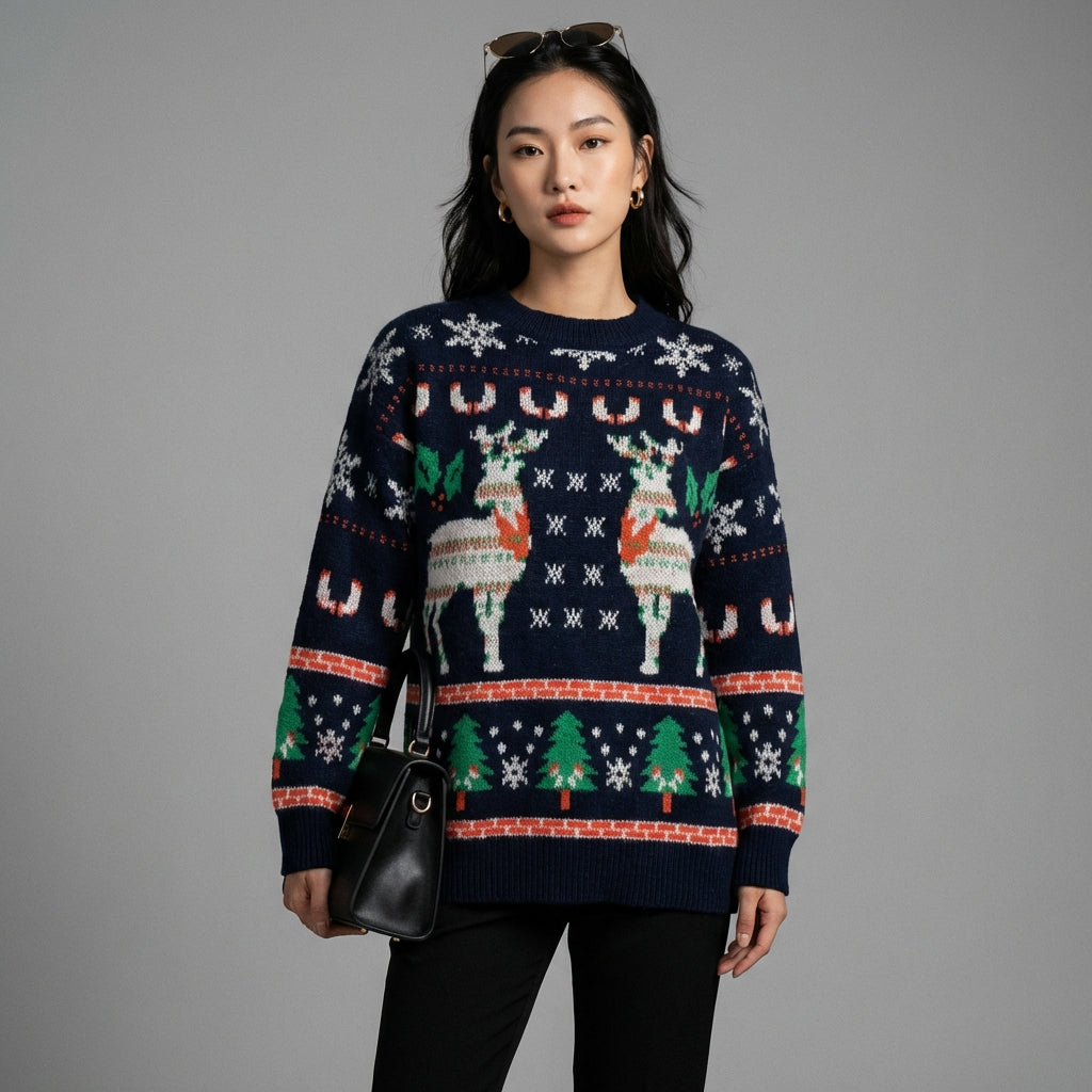 Adotta un look trendy e accogliente con il nostro maglione jacquard a girocollo, ornato da un distintivo motivo a cervo. Il suo design "color blocking" aggiunge un tocco moderno e giocoso, perfetto per rallegrare le tue giornate. Un capo essenziale comodo e stiloso per il tuo guardaroba! 🦌