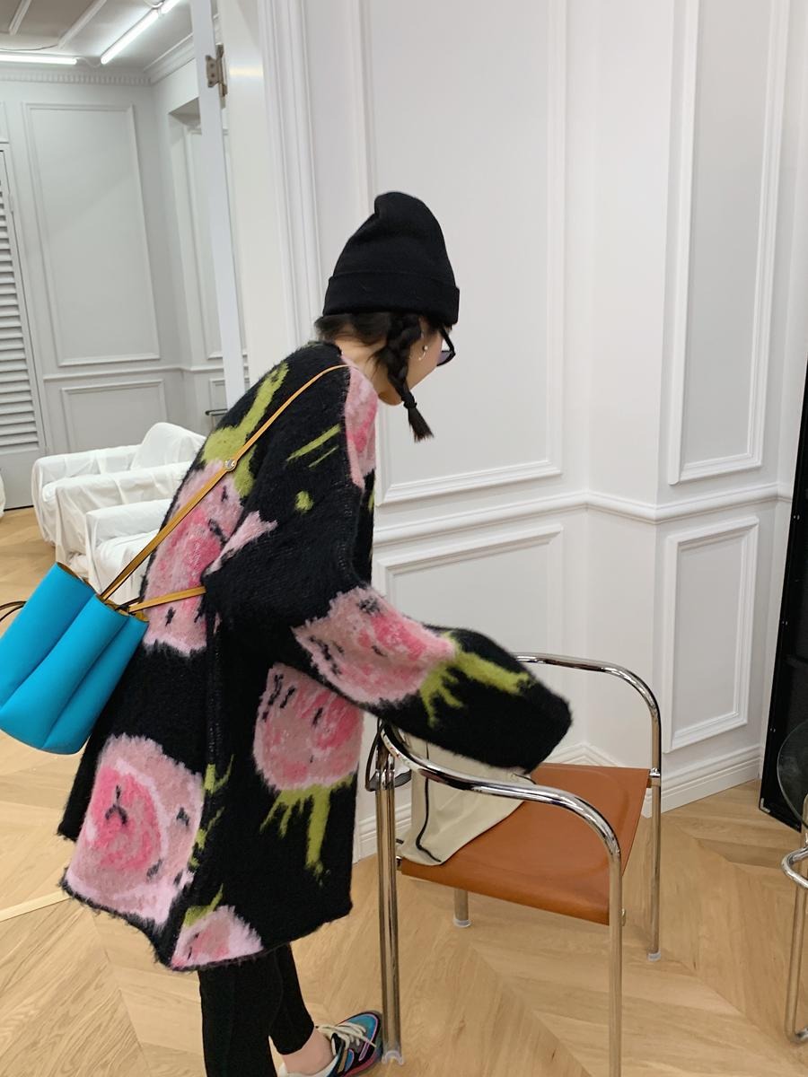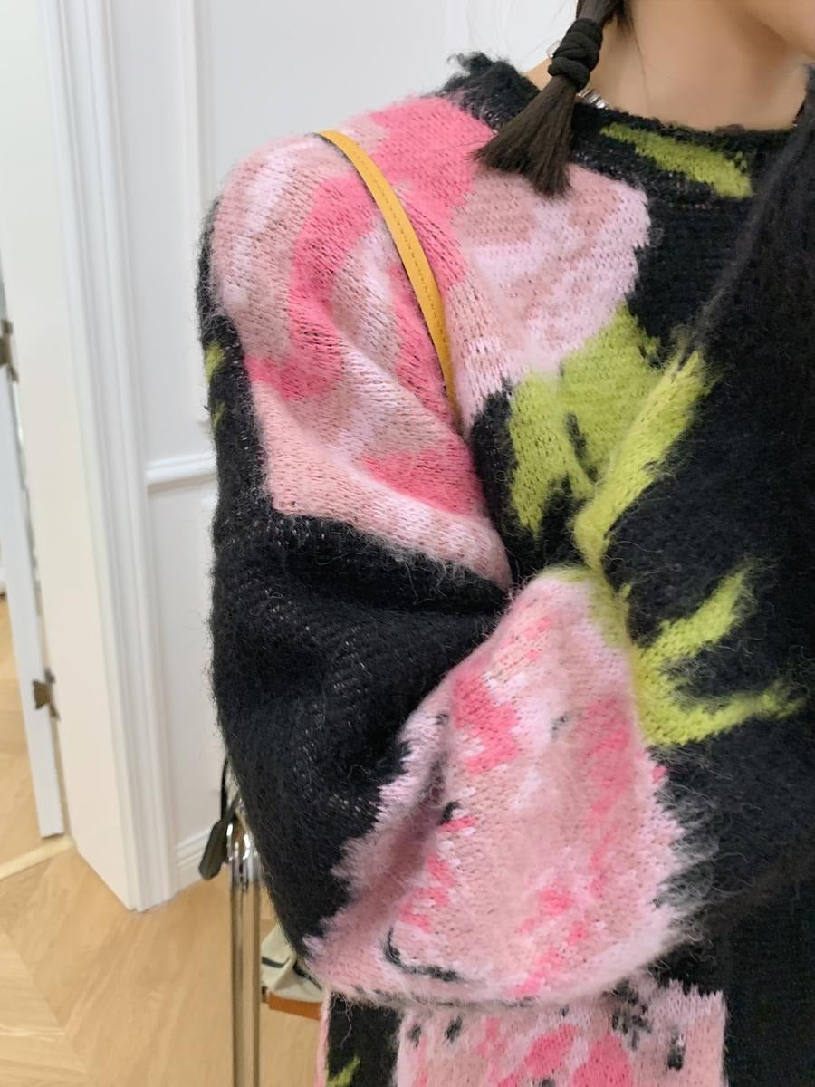 Adotta un look casual ed elegante con il nostro maglione jacquard di media lunghezza con motivi floreali rosa su sfondo nero. Perfetto per i tuoi momenti di relax! 🌸