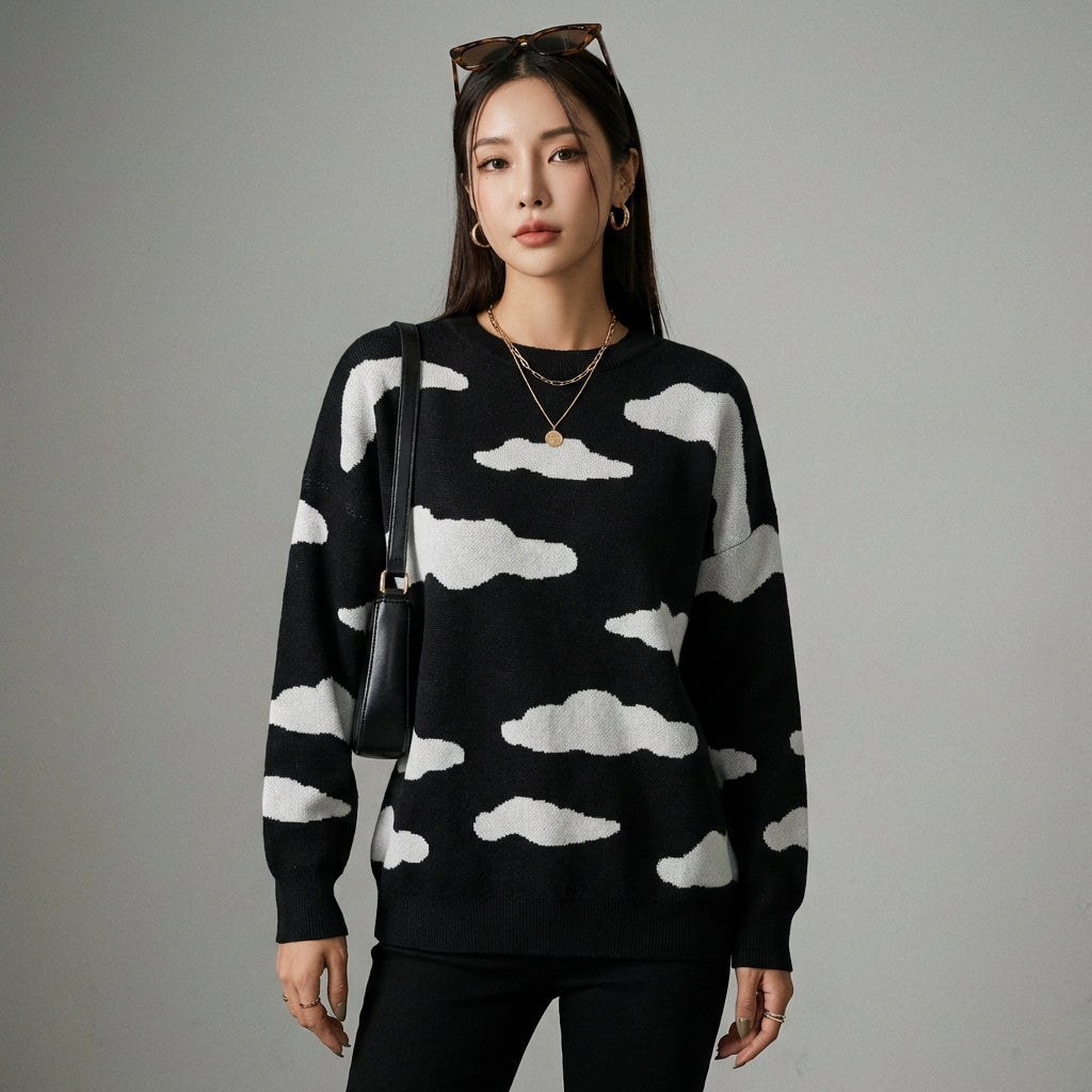 Adotta un look casual e di tendenza con il nostro maglione a maniche lunghe decorato con motivi a nuvole. Il suo girocollo e il taglio regolare lo rendono un capo essenziale comodo ed elegante per ogni occasione! ☁️