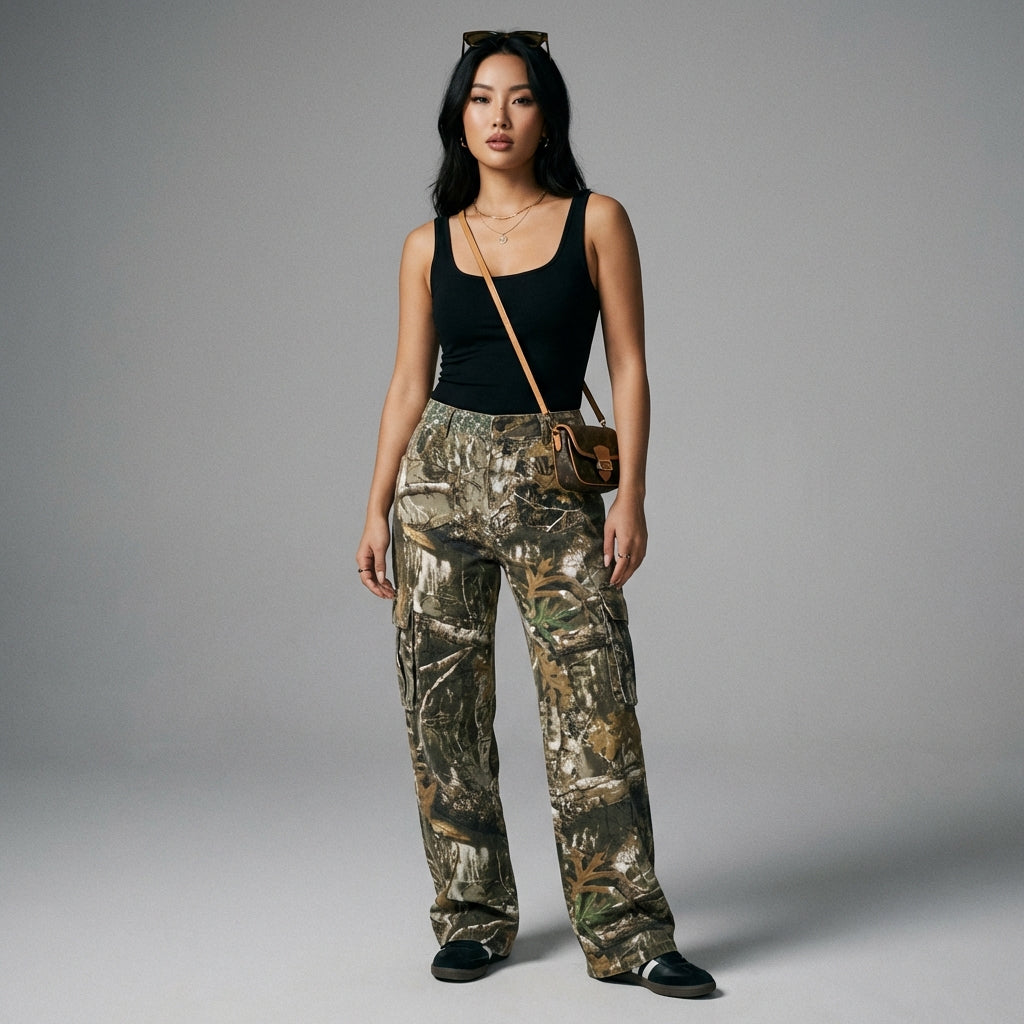 - Tipo: Cargo, Vita Alta, Gamba Larga. Un taglio moderno e funzionale, che offre una silhouette rilassata e di tendenza.