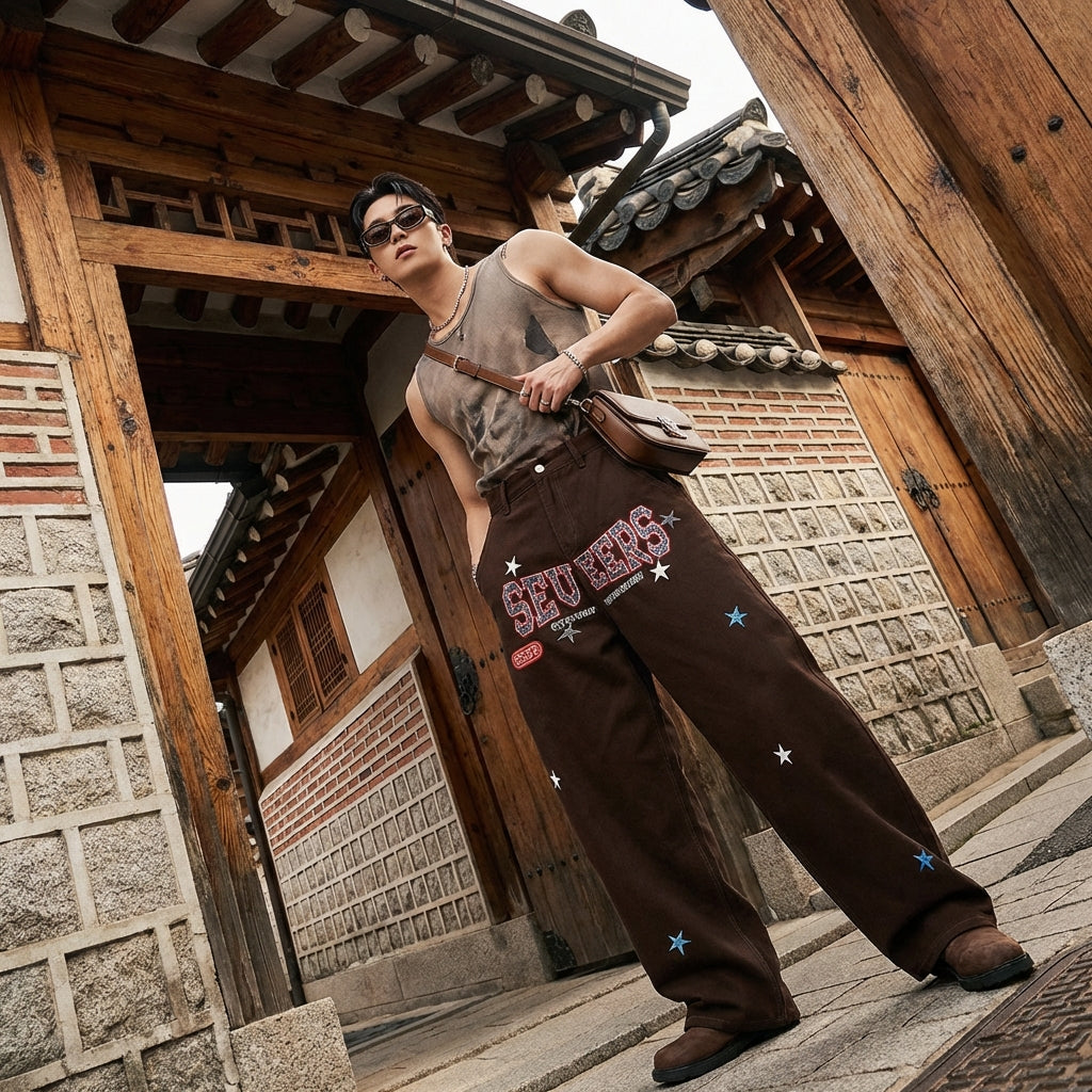 - Stile: Streetwear, Casual, K-fashion. Questi pantaloni incarnano lo spirito della moda urbana coreana, con un tocco di eleganza casual.
