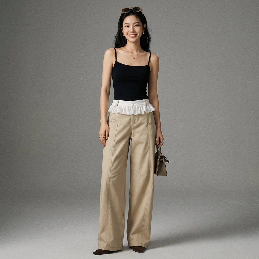 Adotta un look trendy e sofisticato con i nostri pantaloni larghi a vita alta, impreziositi da dettagli in pizzo. Ideali per un'eleganza casual chic o uno stile streetwear deciso! ✨