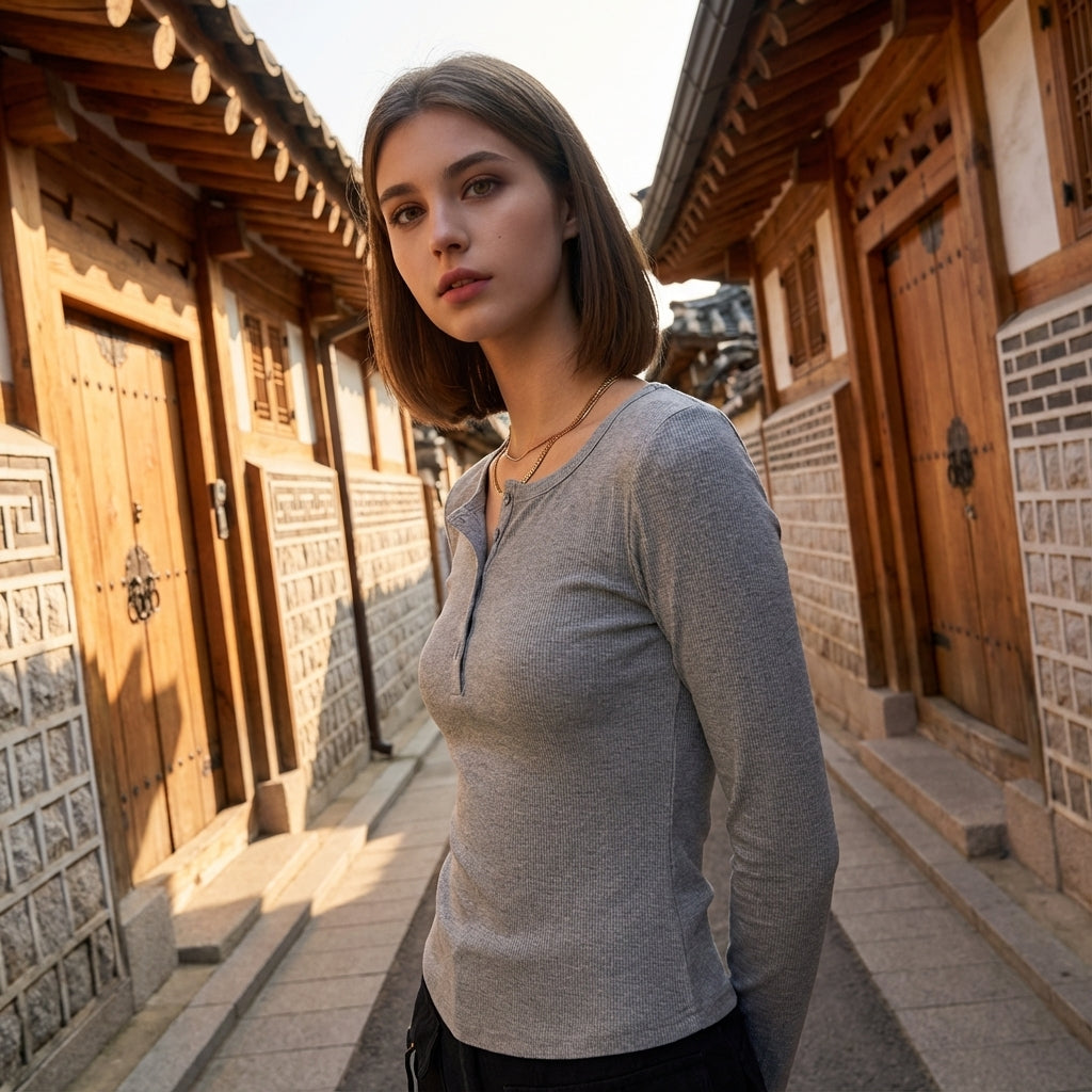 - Stile: Minimalista, Tendenza, K-fashion. Questo top incarna la semplicità chic e le linee pulite della moda coreana contemporanea.
