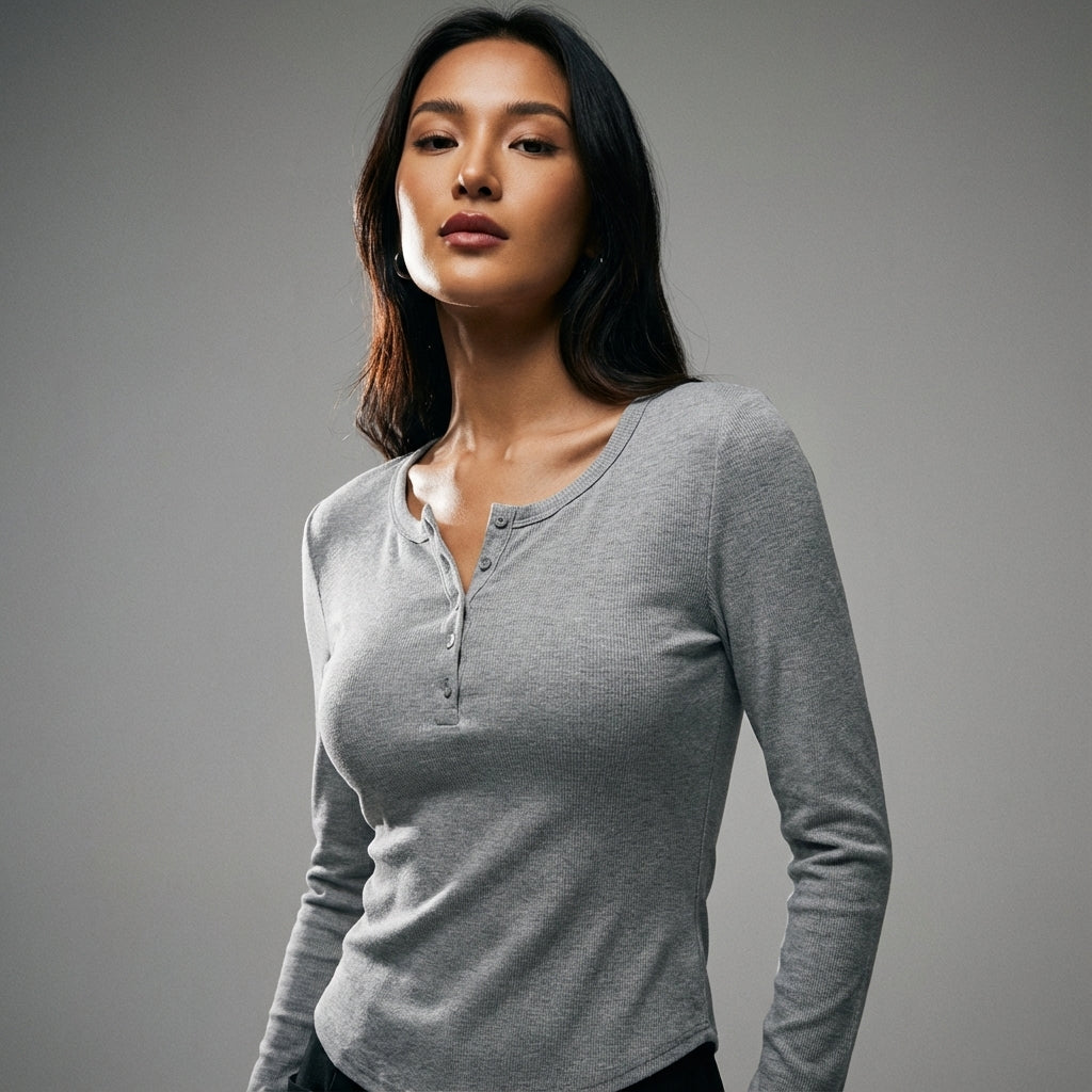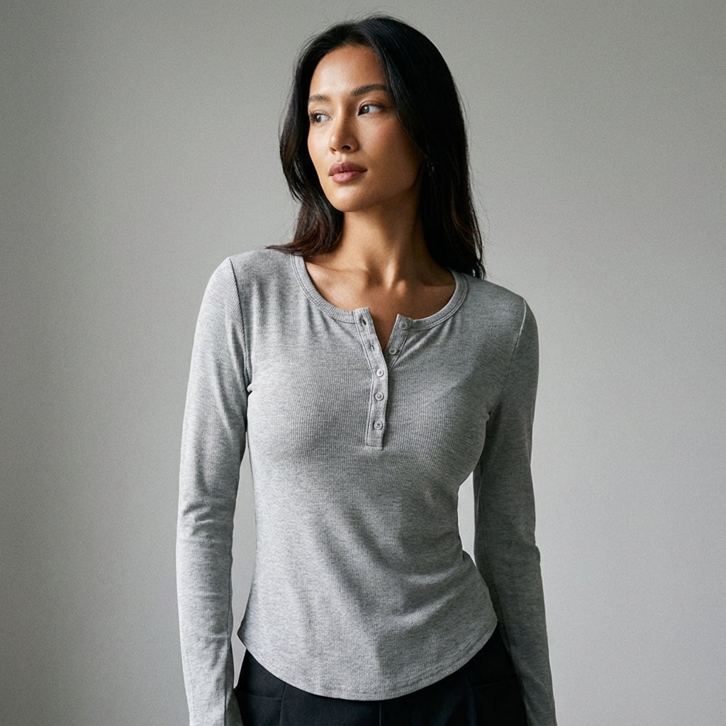 - Tipo: Slim fit, Girocollo, Maniche lunghe. Un taglio aderente che valorizza la silhouette, con eleganti dettagli abbottonati.