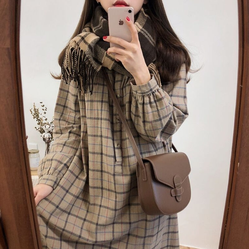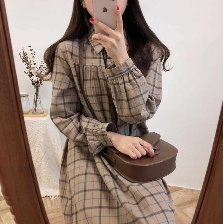 Se sei una studentessa o cerchi di avere lo stile di una giovane coreana, questo abito a maniche lunghe è perfetto per te. Il tessuto è piacevole e presenta un motivo a quadri.