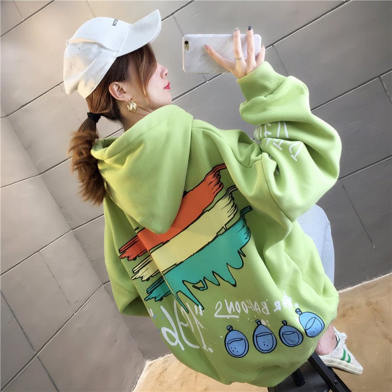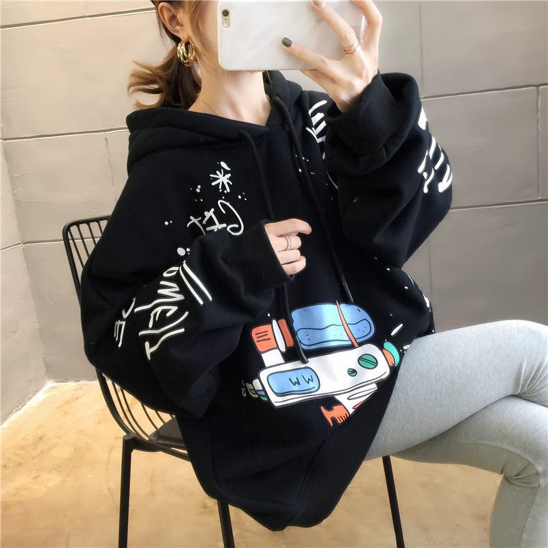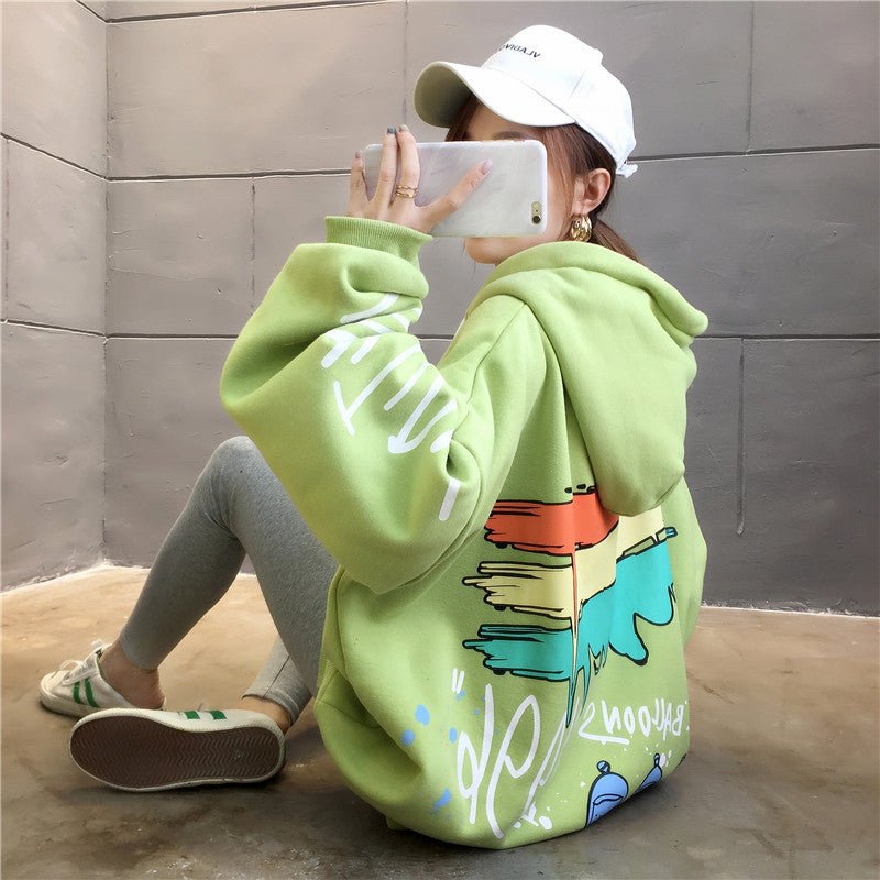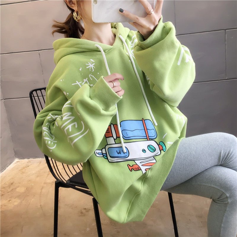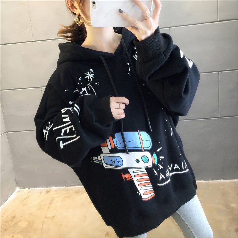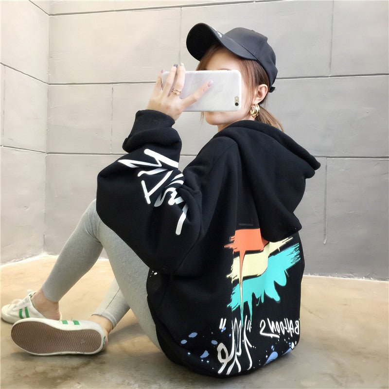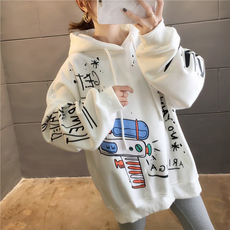 Questa comoda felpa con cappuccio è stampata con molti disegni che le conferiscono un look Hip Hop. Balla al ritmo della musica KPOP indossando questa felpa.