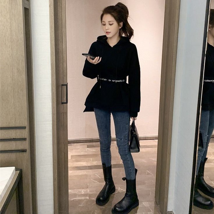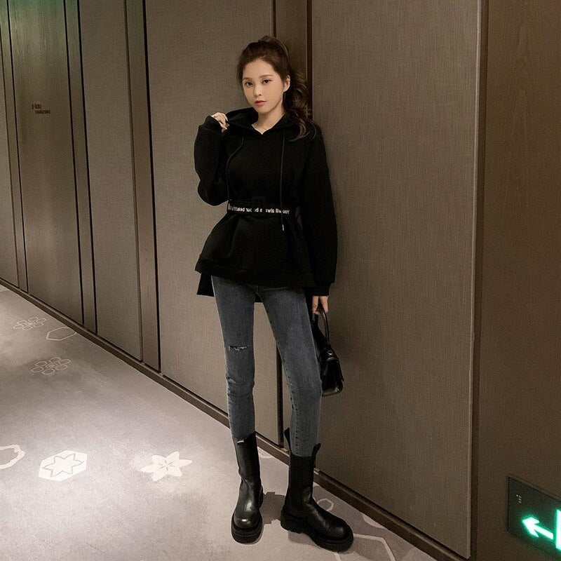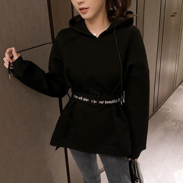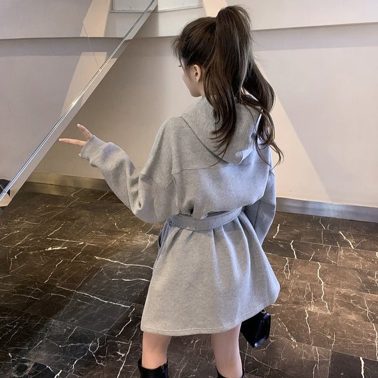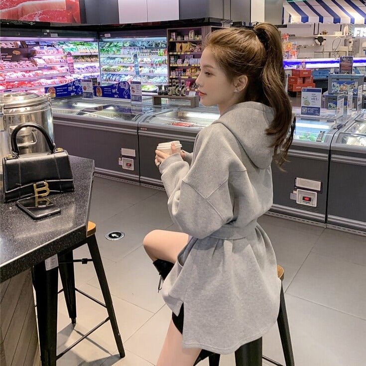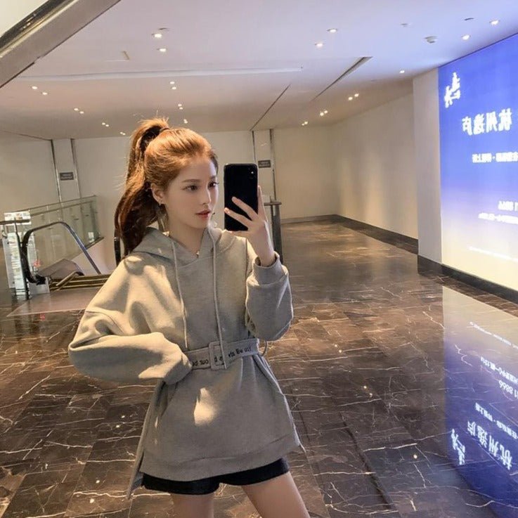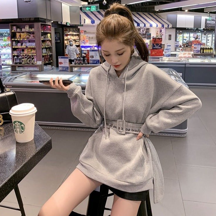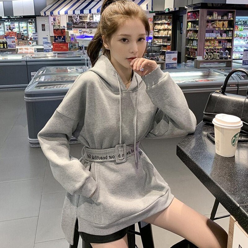 Ti piace indossare comode felpe con cappuccio? Questa felpa lunga fa per te! Approfitta della cintura in felpa per adottare un look coreano.
