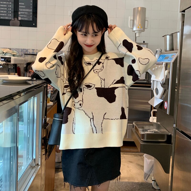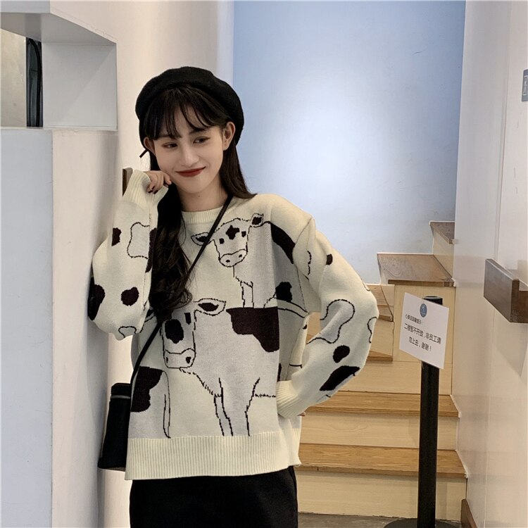 Se ami le mucche, questo maglione coreano è fatto per te. Rappresenta mucche bianche e nere. È un maglione molto apprezzato dalle giovani coreane. La mucca è un animale carino e sensibile che merita di essere sui nostri maglioni. Indossa con orgoglio le mucche sul tuo maglione alla moda.