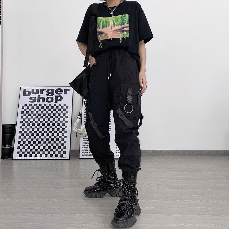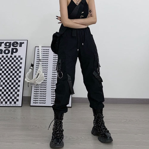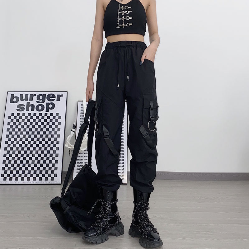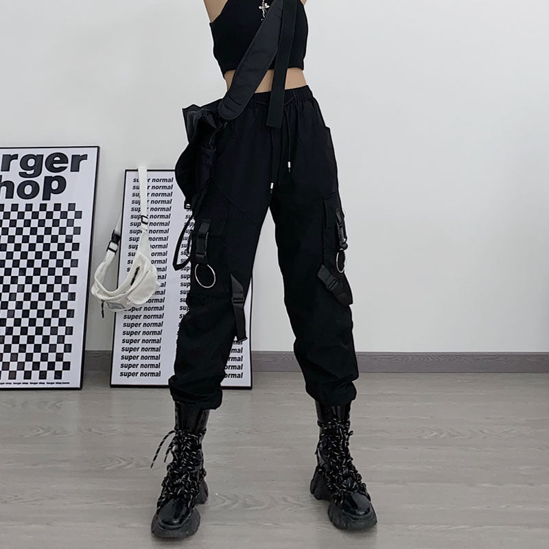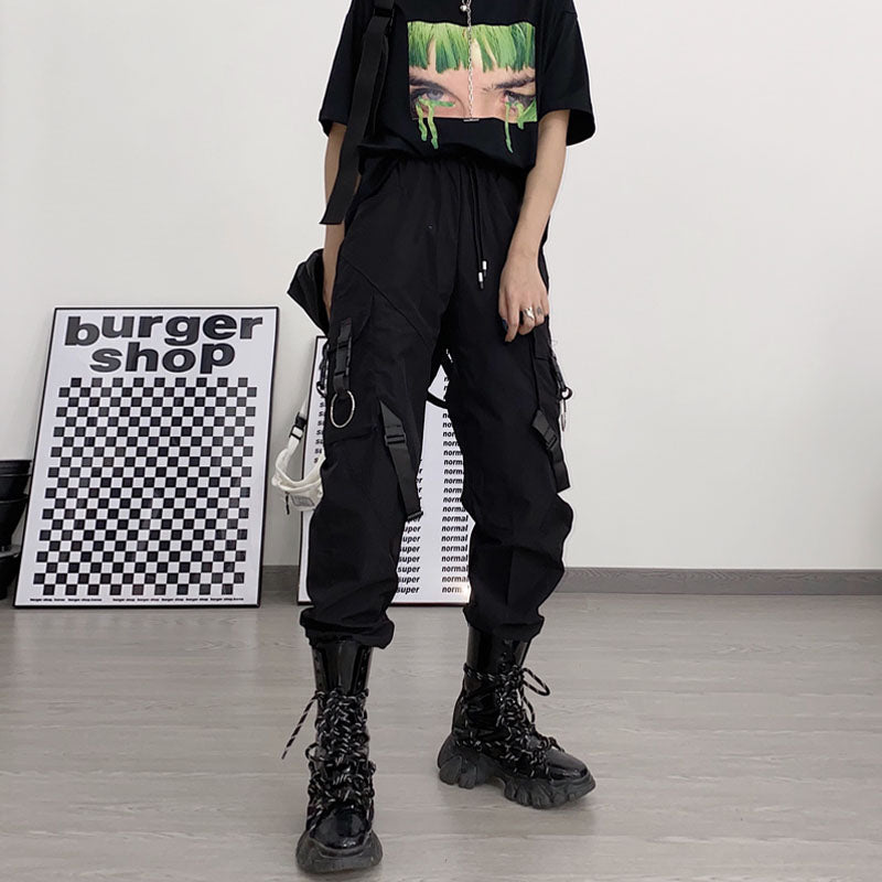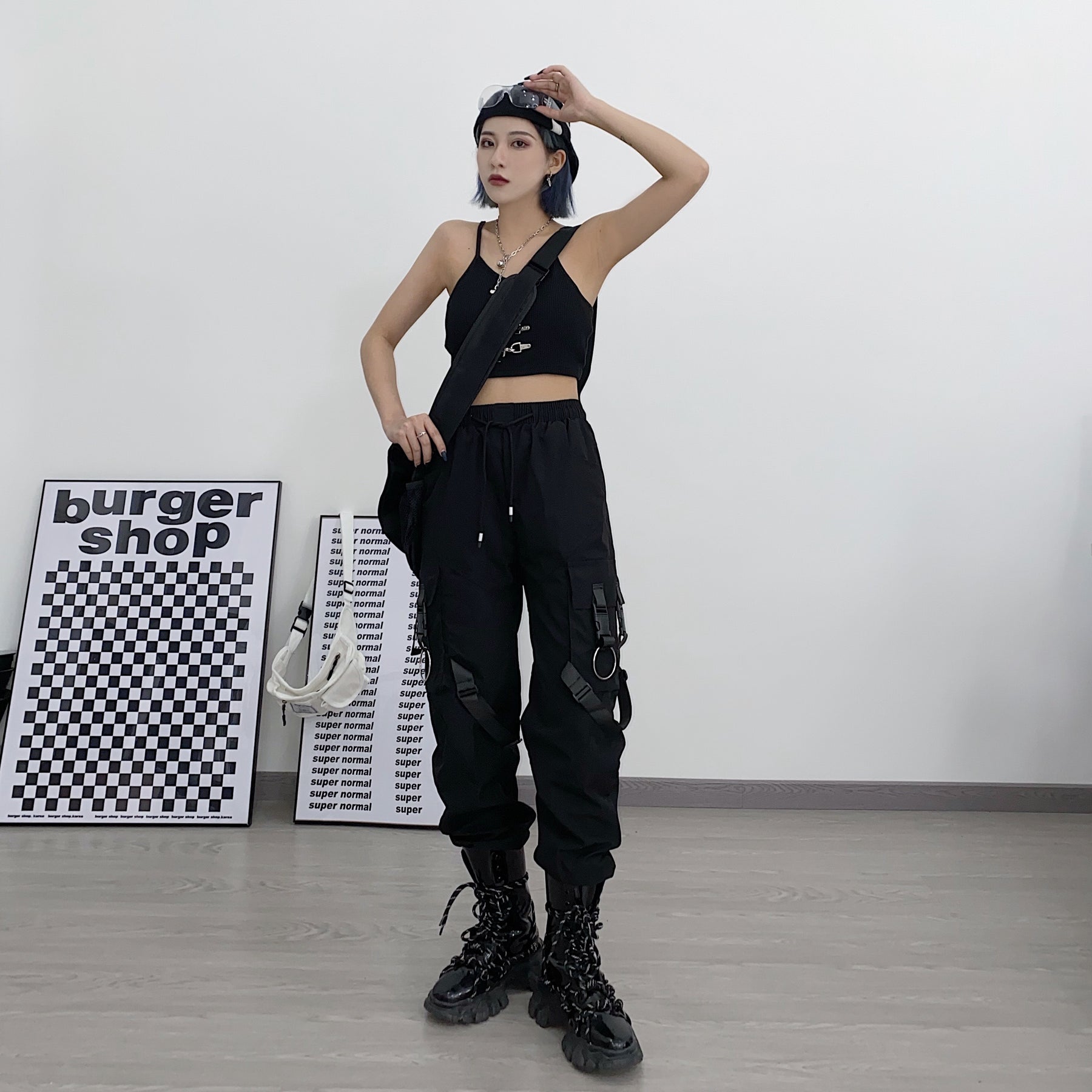 Cerchi un pantalone con parti staccabili? Ecco il pantalone streetwear con clip. Queste clip in plastica danno stile al tuo outfit. È lo stile futuristico coreano che piace molto al momento. Questo pantalone è di colore nero.