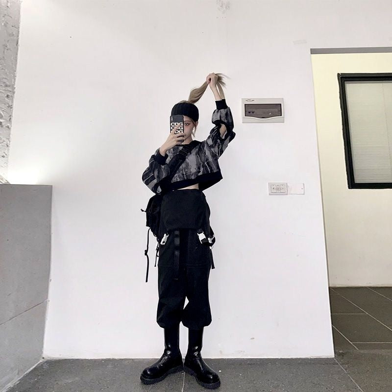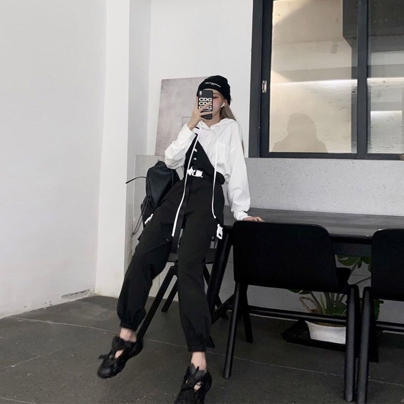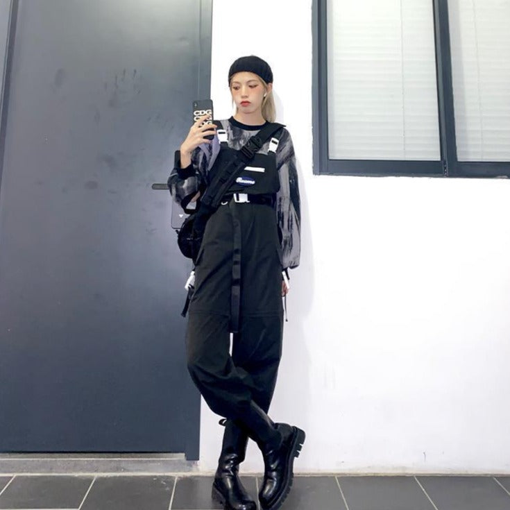 Ecco una salopette molto popolare tra i giovani coreani. Rappresenta la moda Techwear. È un outfit nero con parti e chiusure bianche. È molto di tendenza in Corea del Sud.