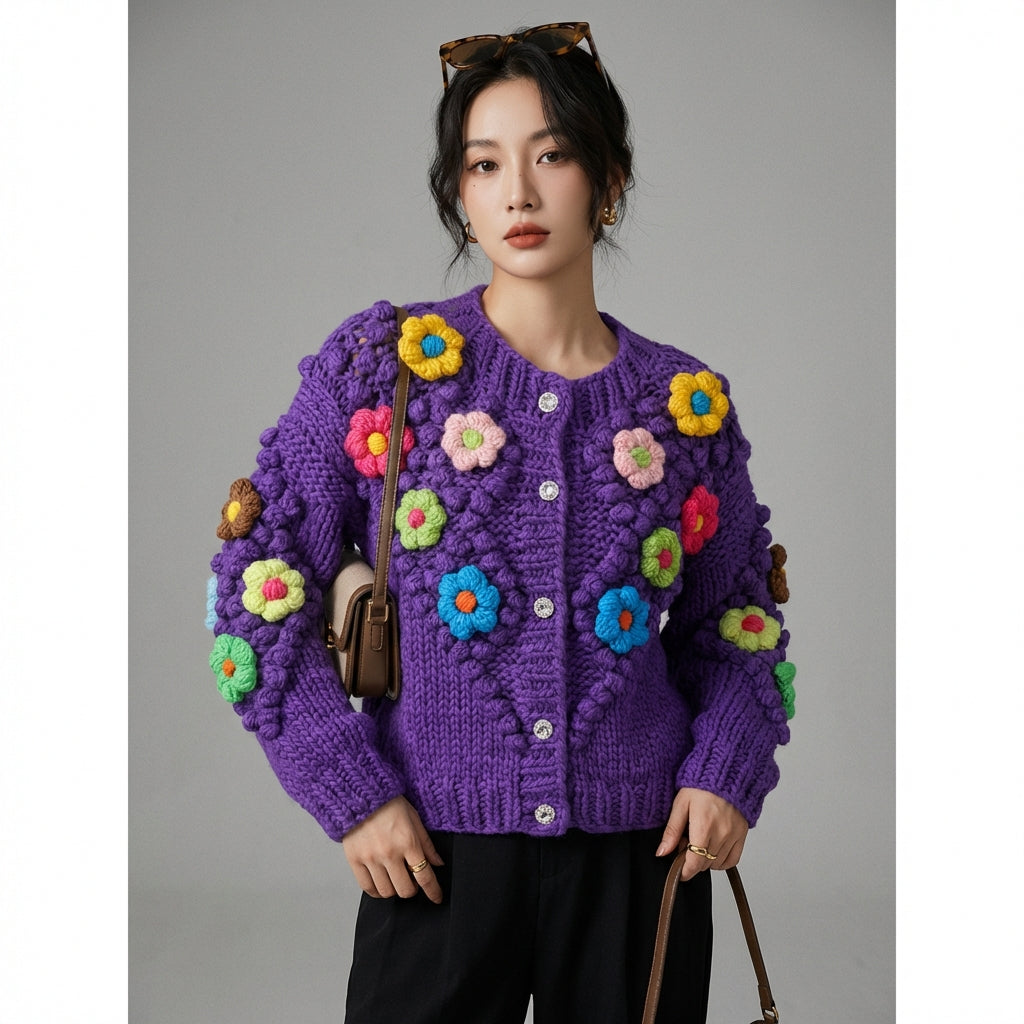 Adotta un look dolce e femminile con il nostro cardigan in lana lavorato a maglia, impreziosito da delicati fiori. Il suo girocollo e le maniche lunghe lo rendono un capo perfetto per rimanere elegante e confortevole in ogni occasione! 🌸
