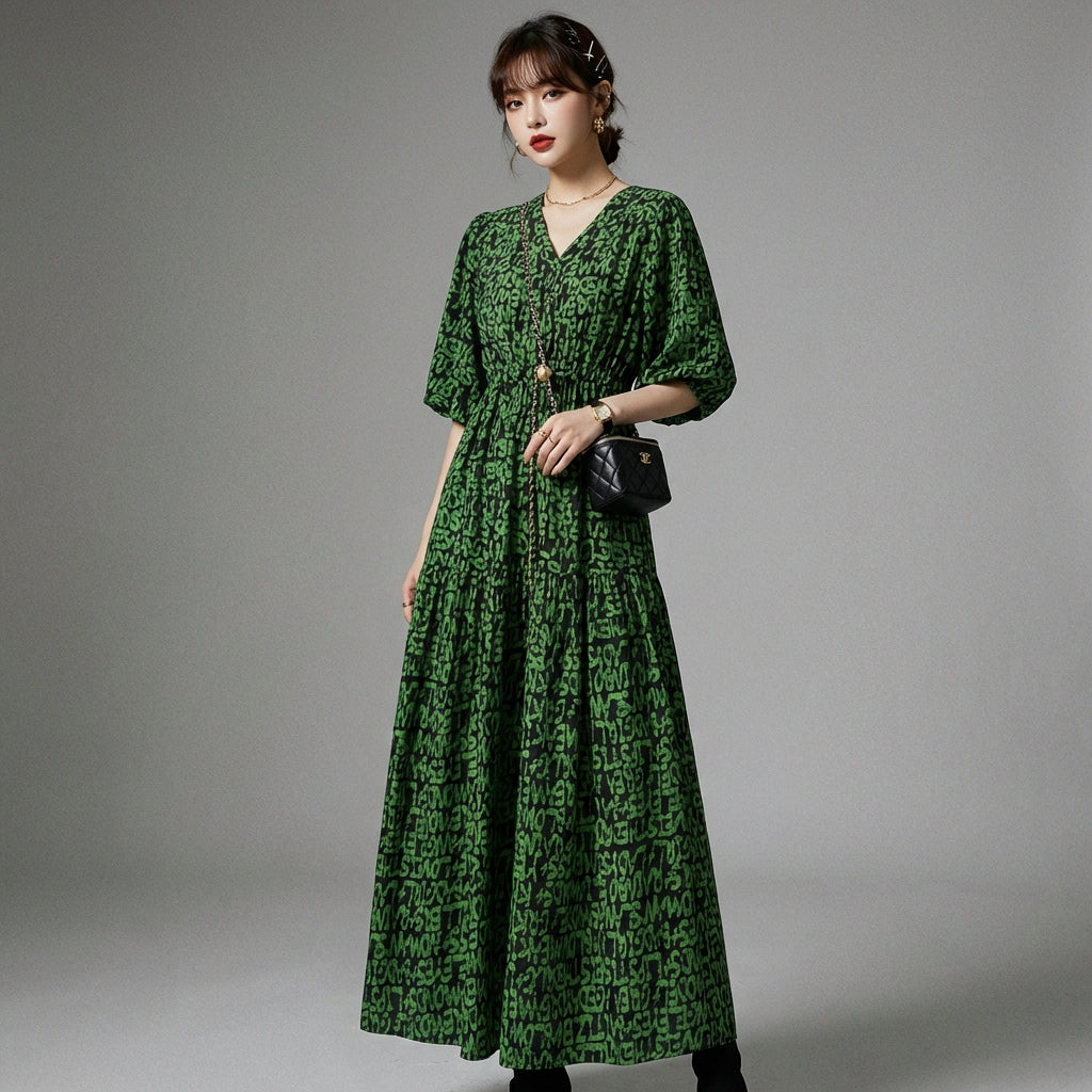 Adotta un look casual e di tendenza con il nostro abito lungo stampato, caratterizzato da uno scollo a V lusinghiero e maniche corte. Il suo taglio fluido e il motivo originale lo rendono il capo perfetto per uno stile deciso e confortevole in ogni stagione! 🌸