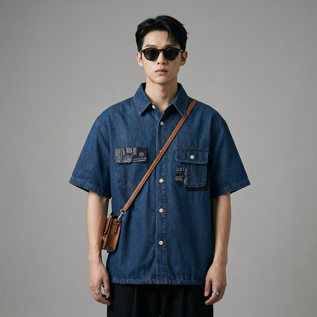 Adotta un look casual e alla moda con la nostra camicia in denim, impreziosita da un motivo a fiore di anacardo. Il suo design ampio e le maniche corte la rendono il capo ideale per uno stile urbano e moderno! ✨