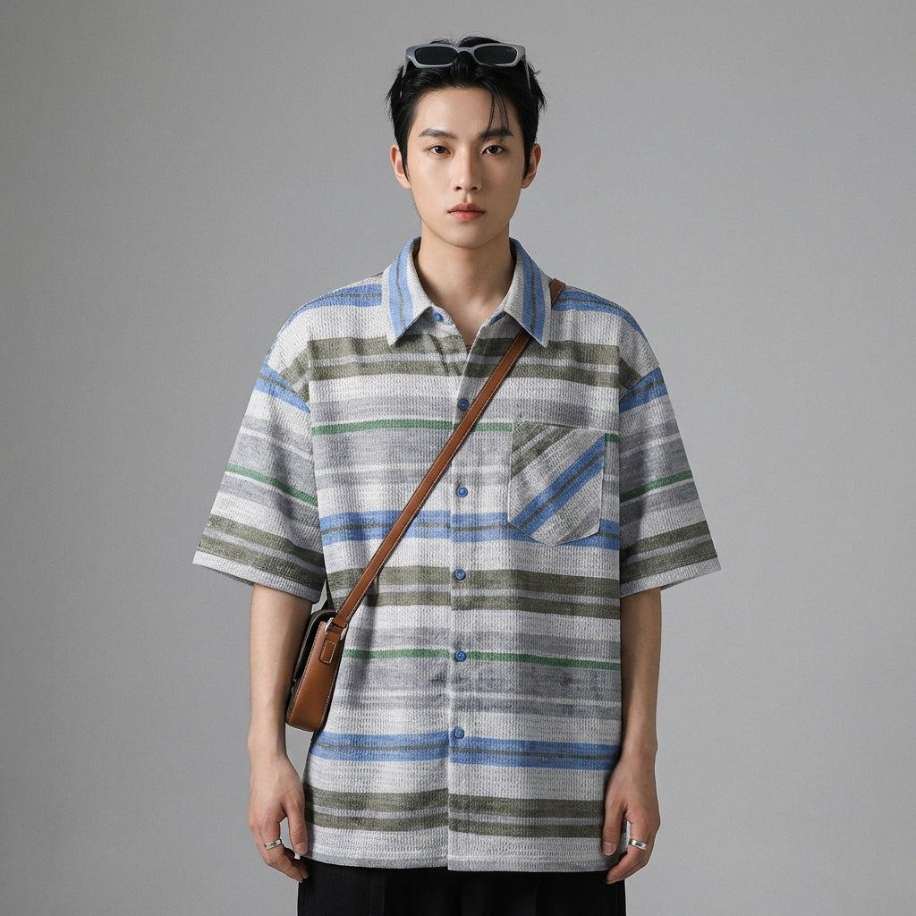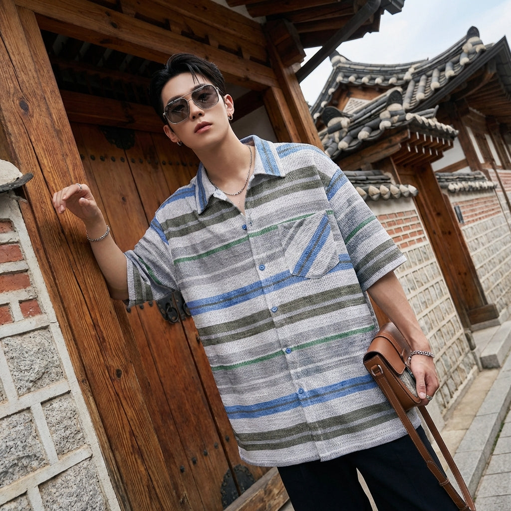 - Stile: Streetwear, K-fashion, Casual, Tendenza. Questa camicia incarna lo spirito della moda coreana con il suo taglio ampio e i suoi motivi a righe, perfetta per un look urbano e alla moda.