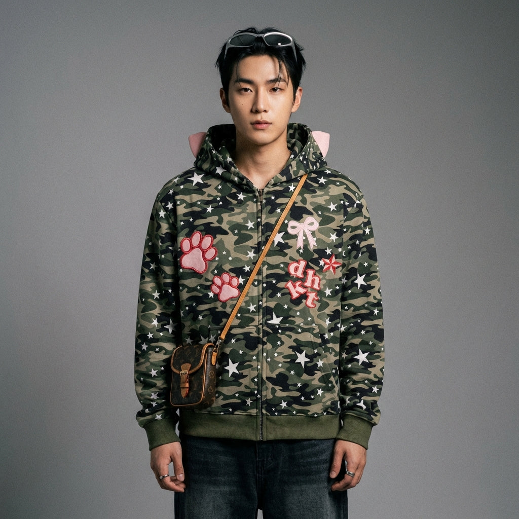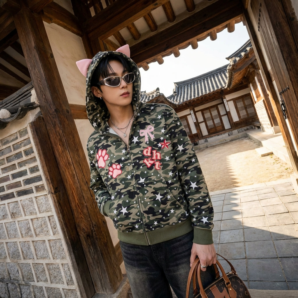 Adotta un look audace e casual con il nostro cardigan con cappuccio unisex, caratterizzato da una stampa mimetica integrale e ricami di impronte stellate. La sua vestibilità ampia assicura un comfort ottimale e uno stile streetwear deciso! ✨