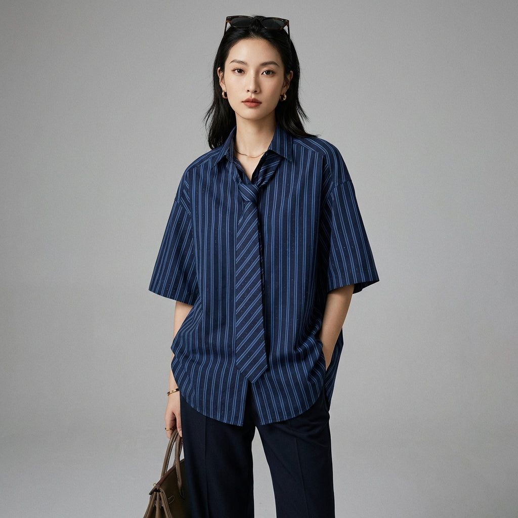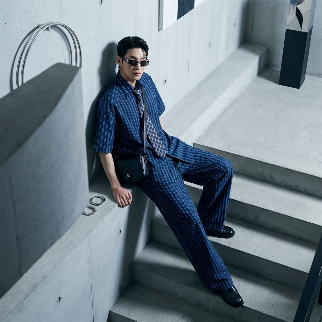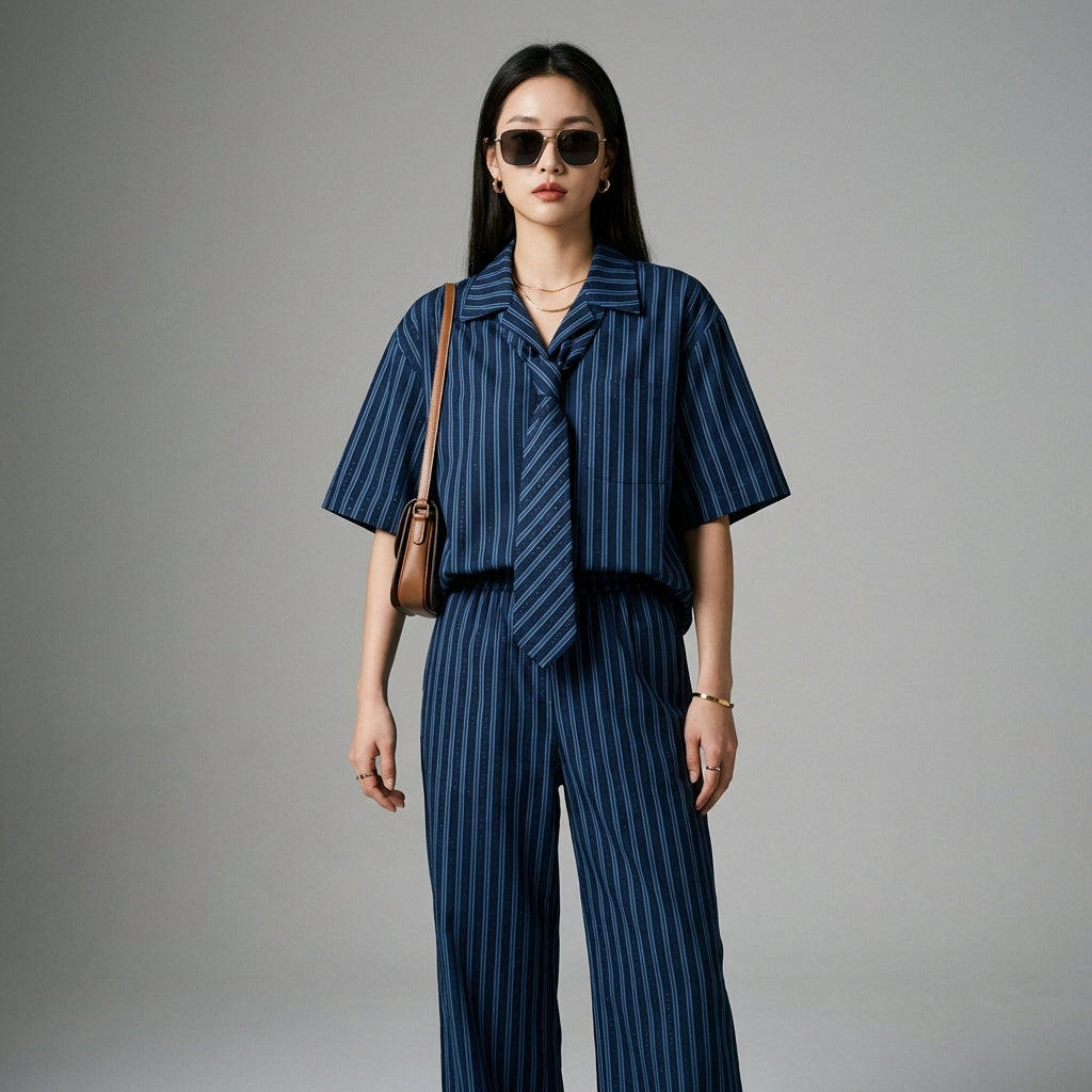 Adotta un look casual e chic con il nostro completo due pezzi a righe. Composto da una camicia a maniche corte dal taglio "boyfriend" e un pantalone lungo abbinato, questo completo offre una silhouette moderna e confortevole, perfetta per tutte le occasioni! 🌟