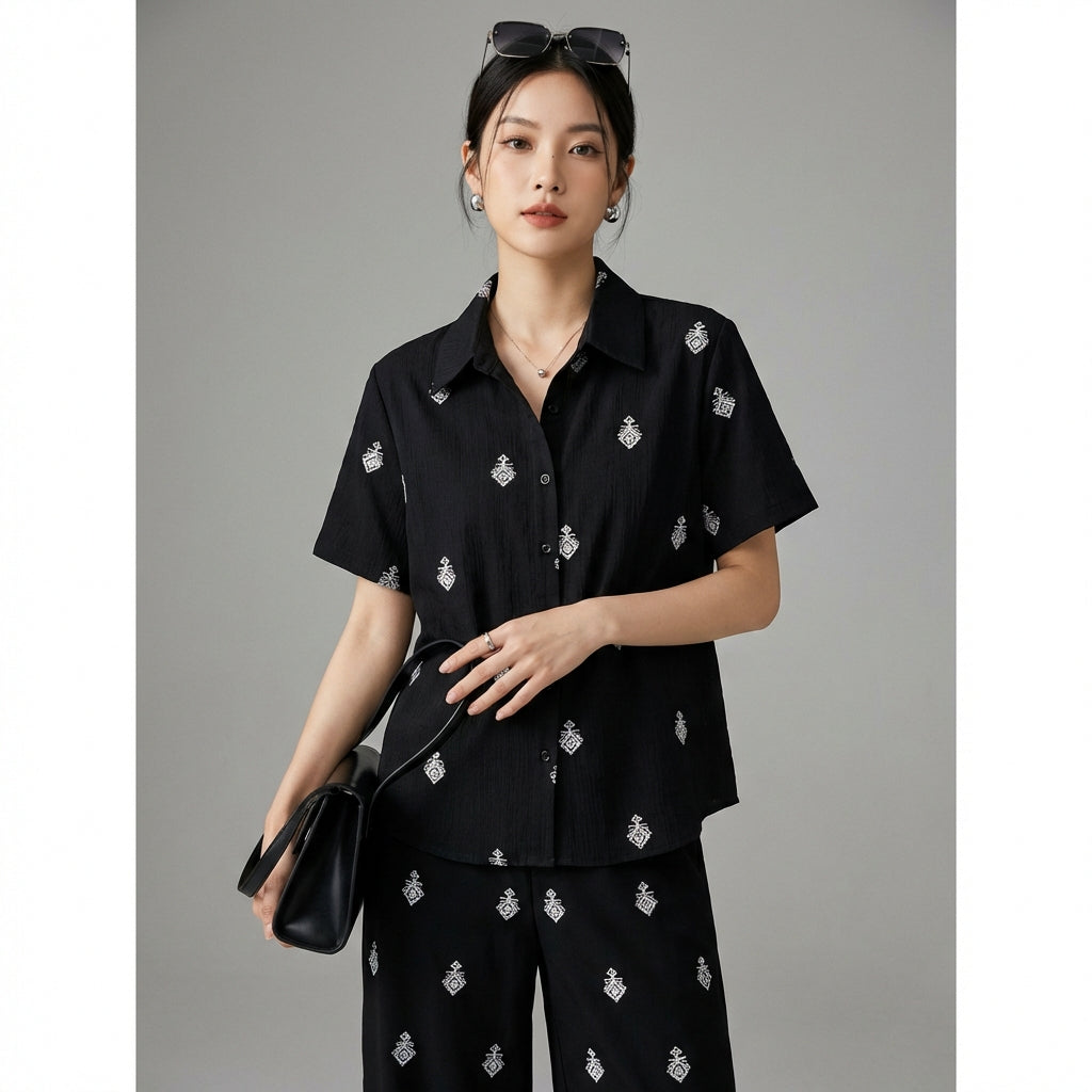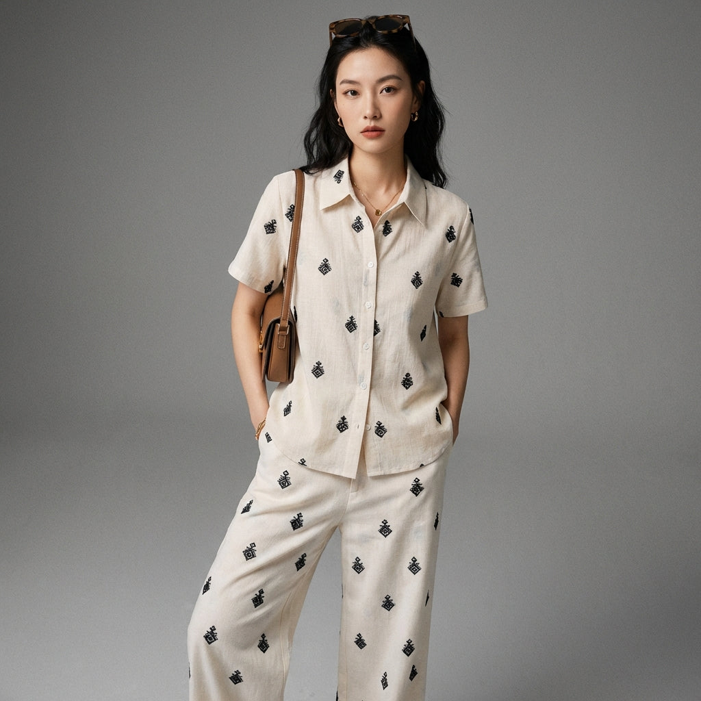 Scopri il nostro completo ricamato, composto da una camicia e pantaloni larghi, perfetto per un look casual ed elegante. I dettagli del ricamo aggiungono un tocco di originalità e raffinatezza a questo completo comodo e versatile! ✨