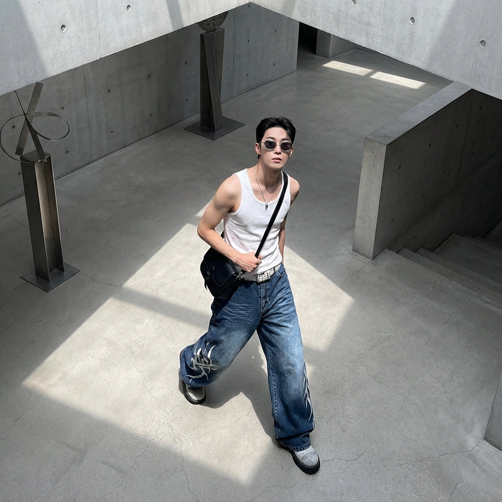 - Stile: Streetwear, Retrò, Casual. Questi jeans incarnano lo spirito della moda urbana coreana, con un tocco vintage e un comfort ottimale per tutti i giorni.