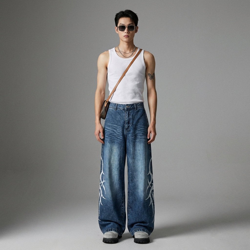 Afferma il tuo stile con i nostri jeans dritti delavati, ornati da una stampa totem unica. Il suo taglio rilassato e la gamba larga aggiungono un tocco retrò e urbano, perfetto per un look casual e alla moda! 👖