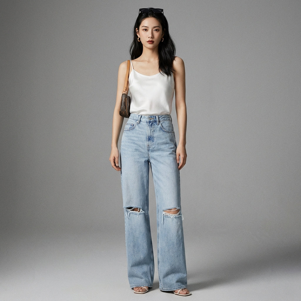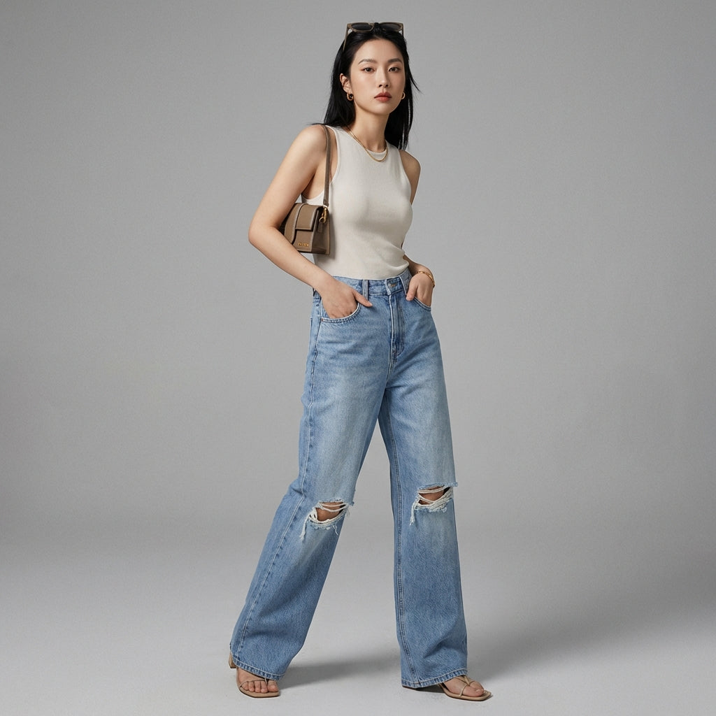 Jean large taille haute déchiré bleu clair - Mode coréenne femme