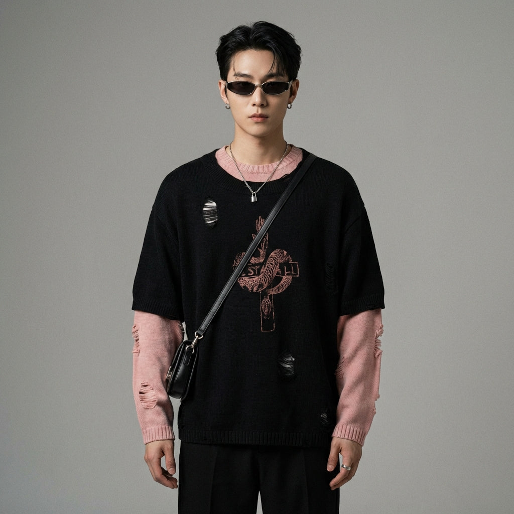 - Stile: Streetwear, Retrò, K-fashion. Questo maglione incarna lo stile urbano coreano con i suoi dettagli strappati e il taglio ampio, perfetto per un look casual e alla moda.