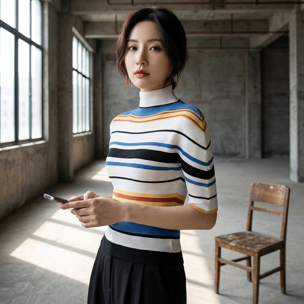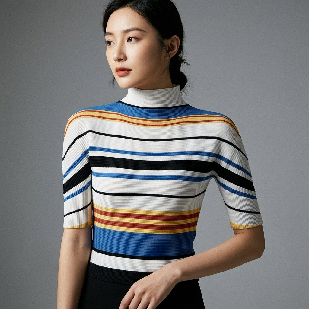 Adotta un look chic e raffinato con la nostra t-shirt a righe a collo alto, perfetta per elevare il tuo stile autunnale. Il suo taglio aderente esalta la silhouette con eleganza e comfort. Ideale per un look quotidiano o un outfit da ufficio raffinato! ✨